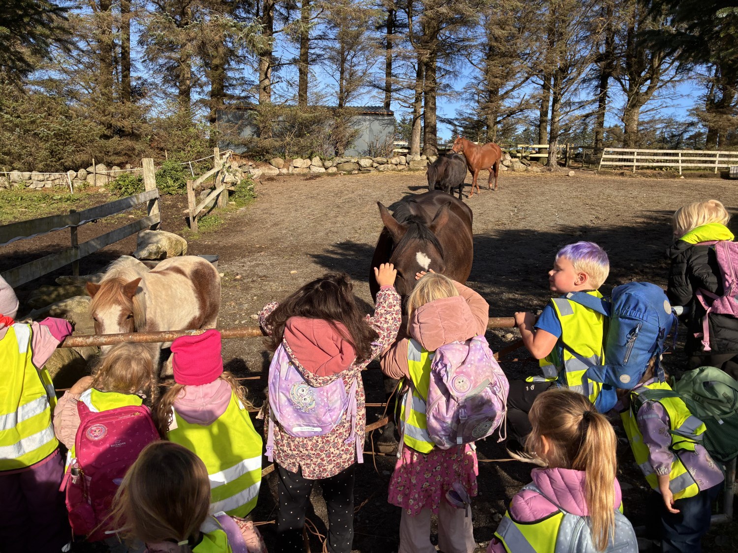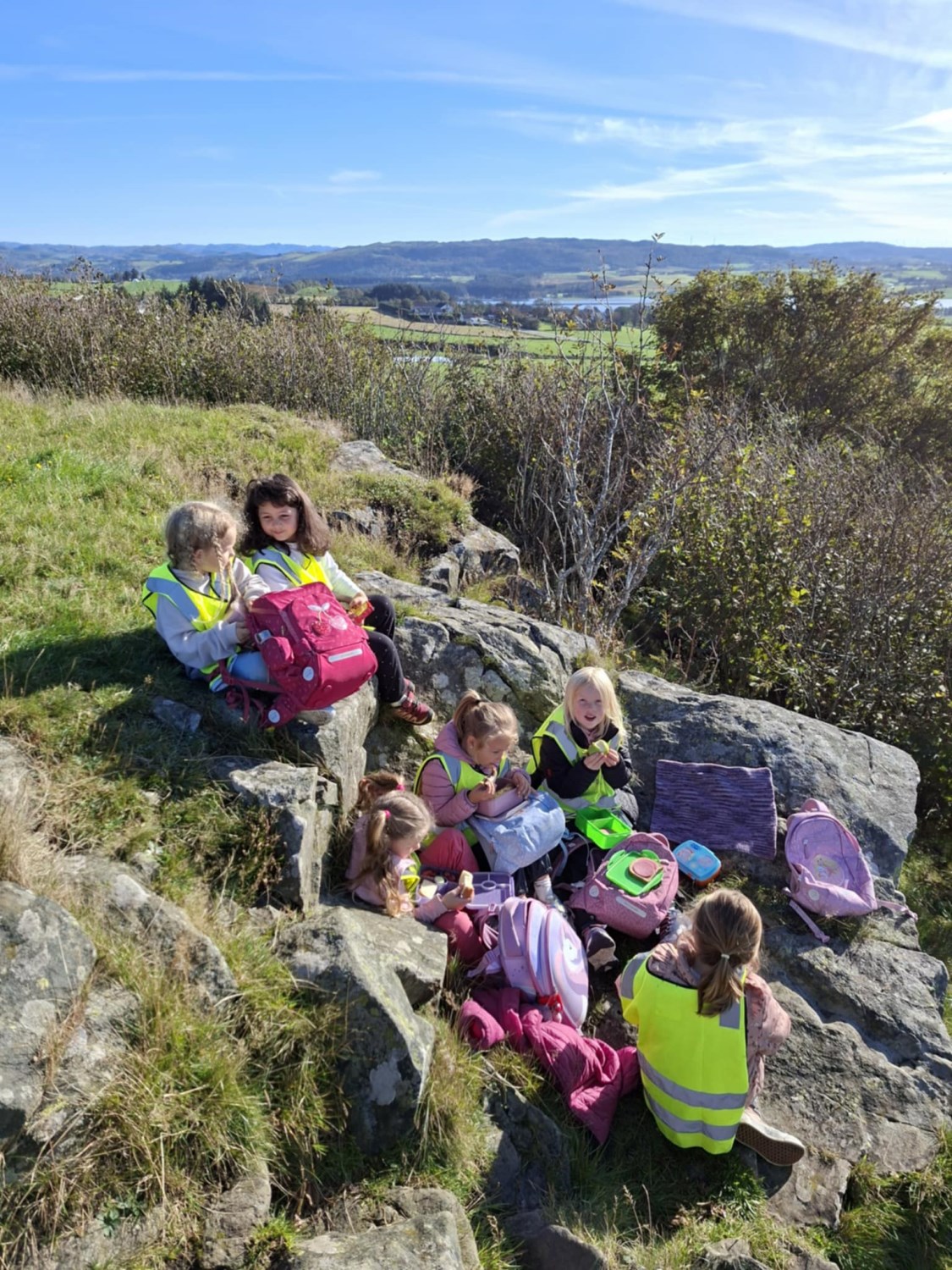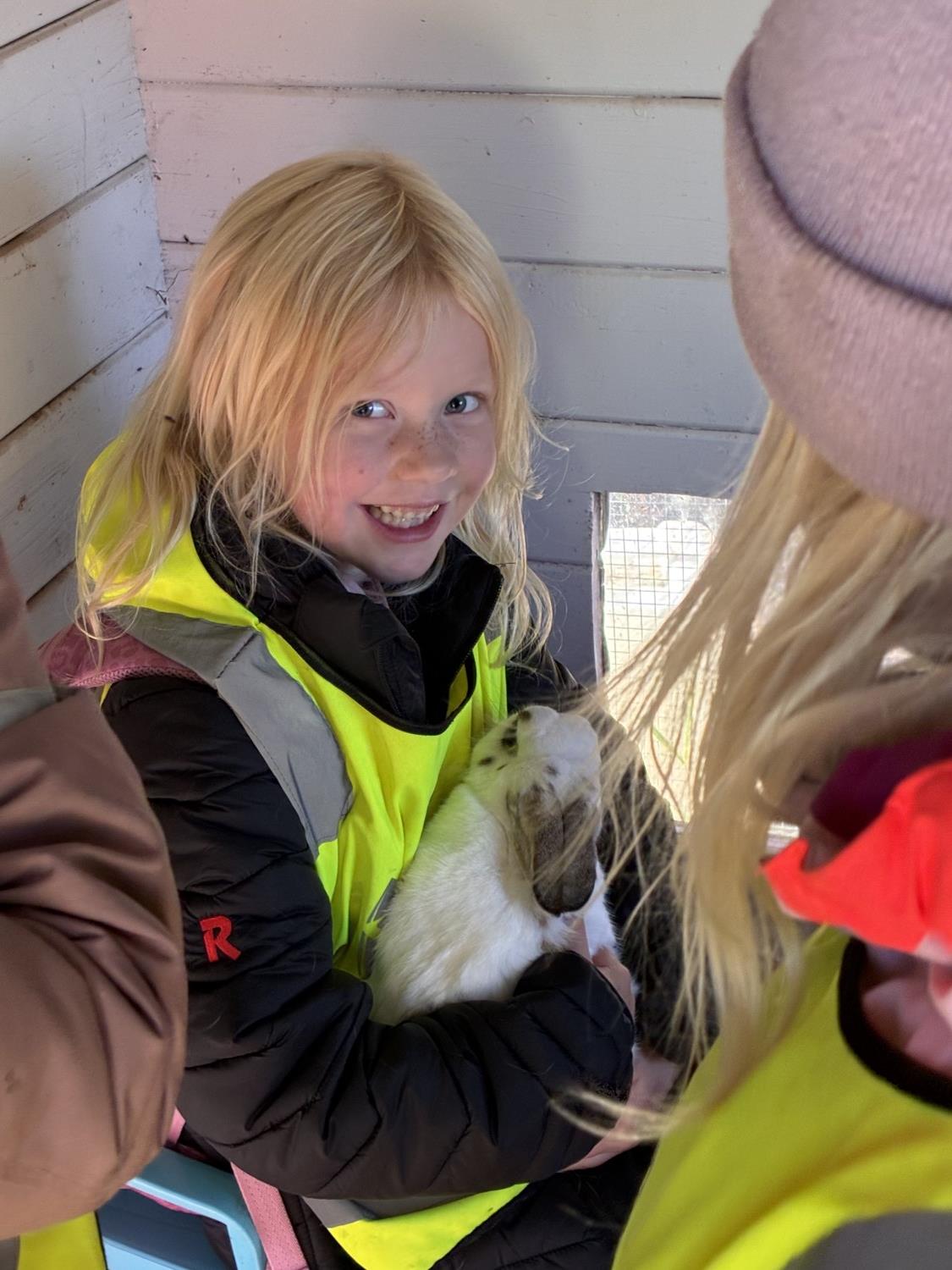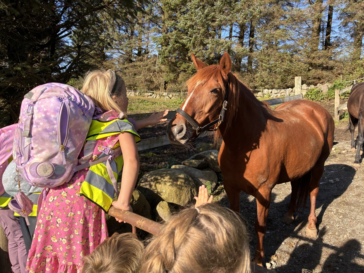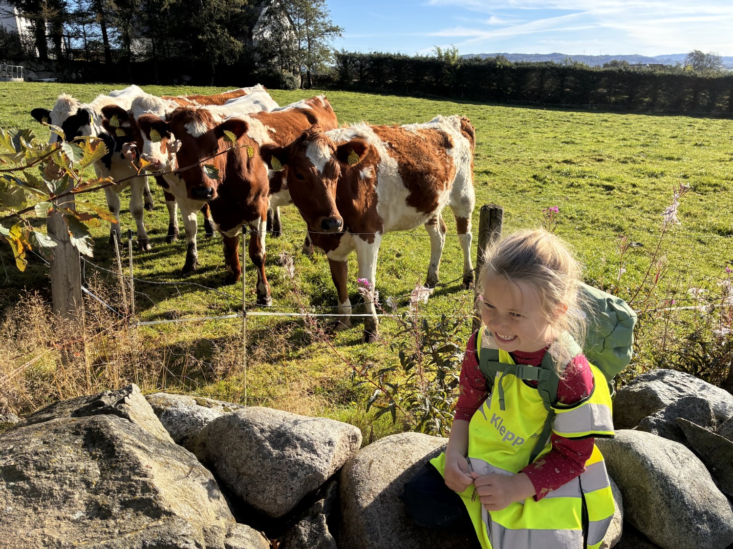 I dag gjekk me heim til Mathilde, der me fekk helsa på både hestar og kaninar. Me åt nista på Tinghaug. Etterpå ble det mykje god leik i bunkers og trea – nokre bygde til og med hytte! Til slutt gjekk me tilbake til skulen, der me var i slengdisser og teikna med kritt på bakken. Nå har me sett kor alle på 1.trinn bur. Alle synes det var stas å visa veg til sitt hus.