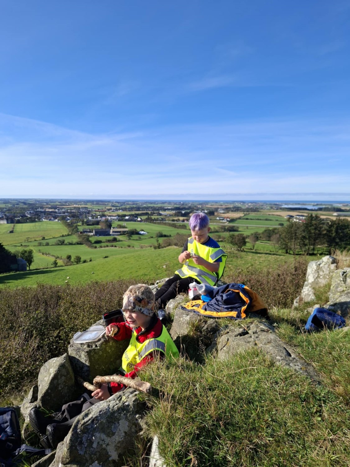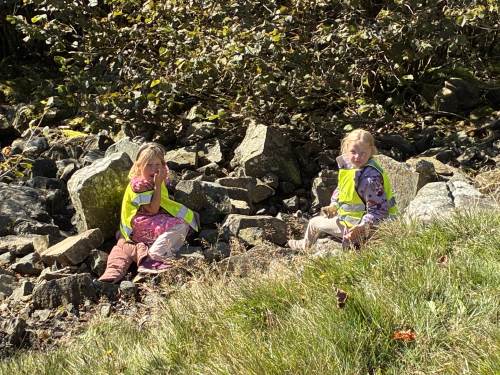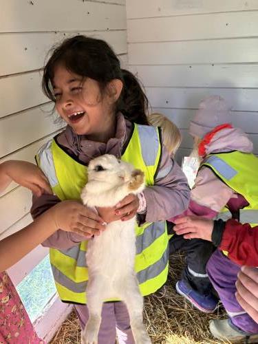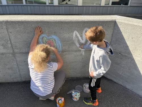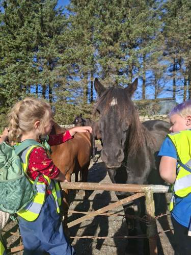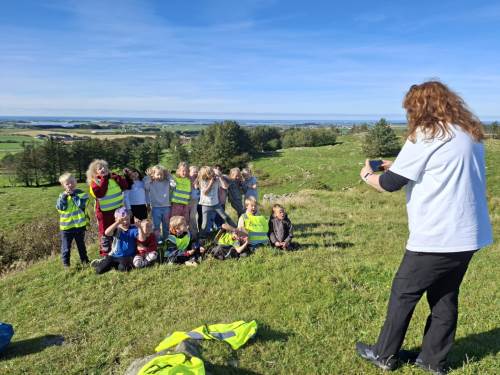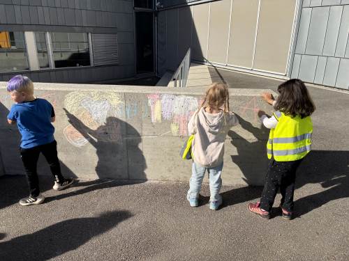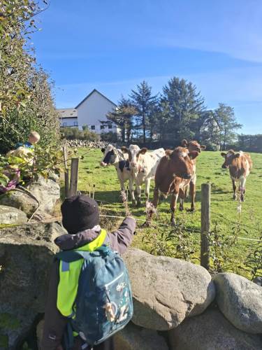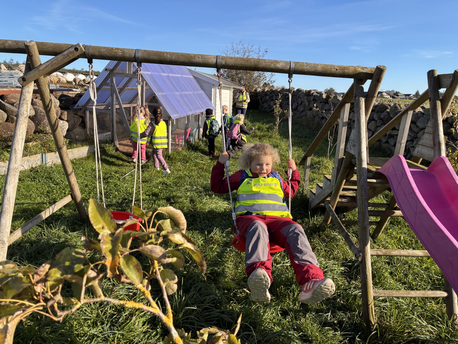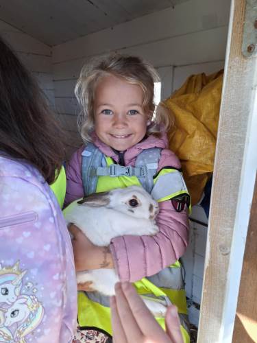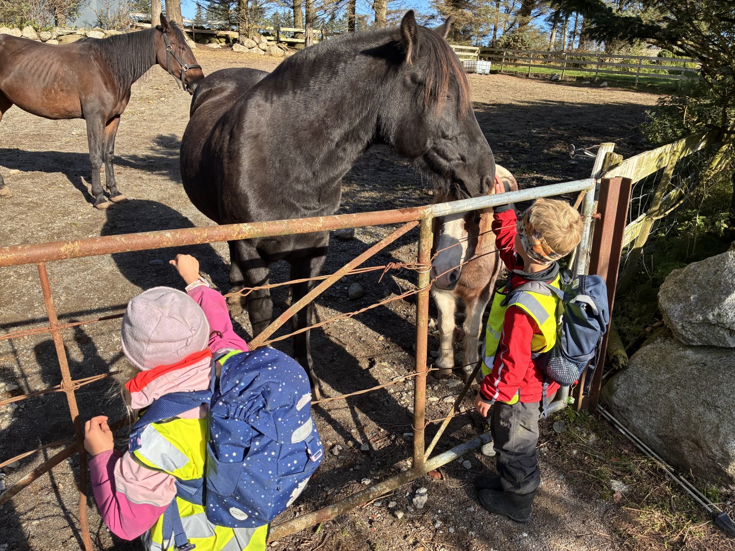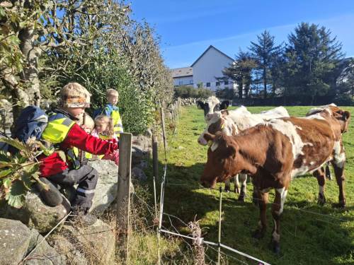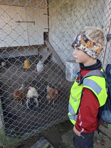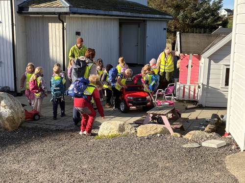I dag gjekk me heim til Mathilde, der me fekk helsa på både hestar og kaninar. Me åt nista på Tinghaug. Etterpå ble det mykje god leik i bunkers og trea – nokre bygde til og med hytte! Til slutt gjekk me tilbake til skulen, der me var i slengdisser og teikna med kritt på bakken. Nå har me sett kor alle på 1.trinn bur. Alle synes det var stas å visa veg til sitt hus.
