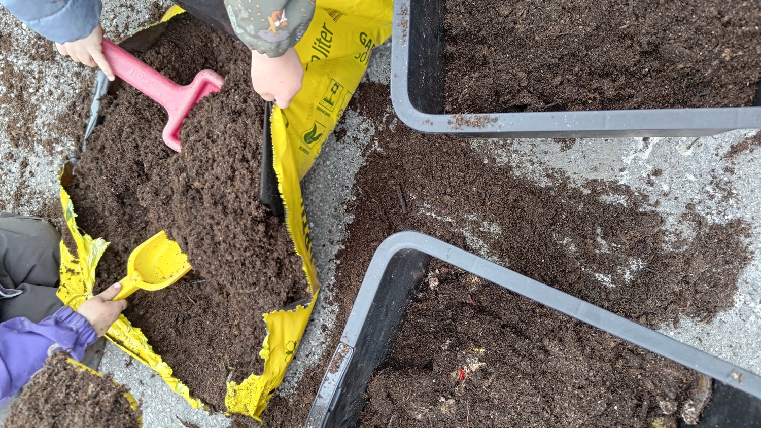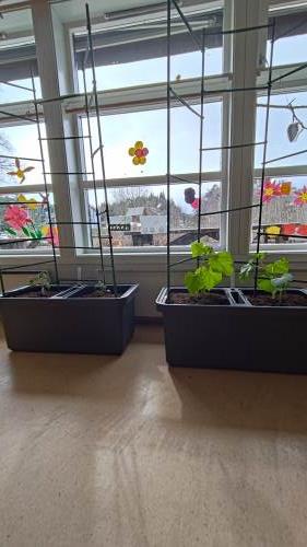 I slutten av februar sådde barna på Kjøttmeis agurk og tomat. De har også hjulpet til med å potte de om. Det er spesielt gøy å fylle jord oppi pottene. I pottene er det også bokashi (kompostert matavfall). Det gir god næring til jorda og så ser barna at matavfallet kan gjøre nytte for seg.