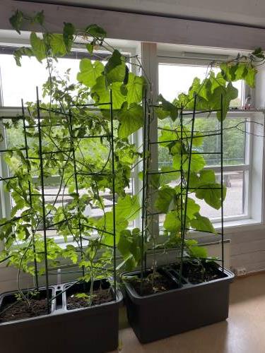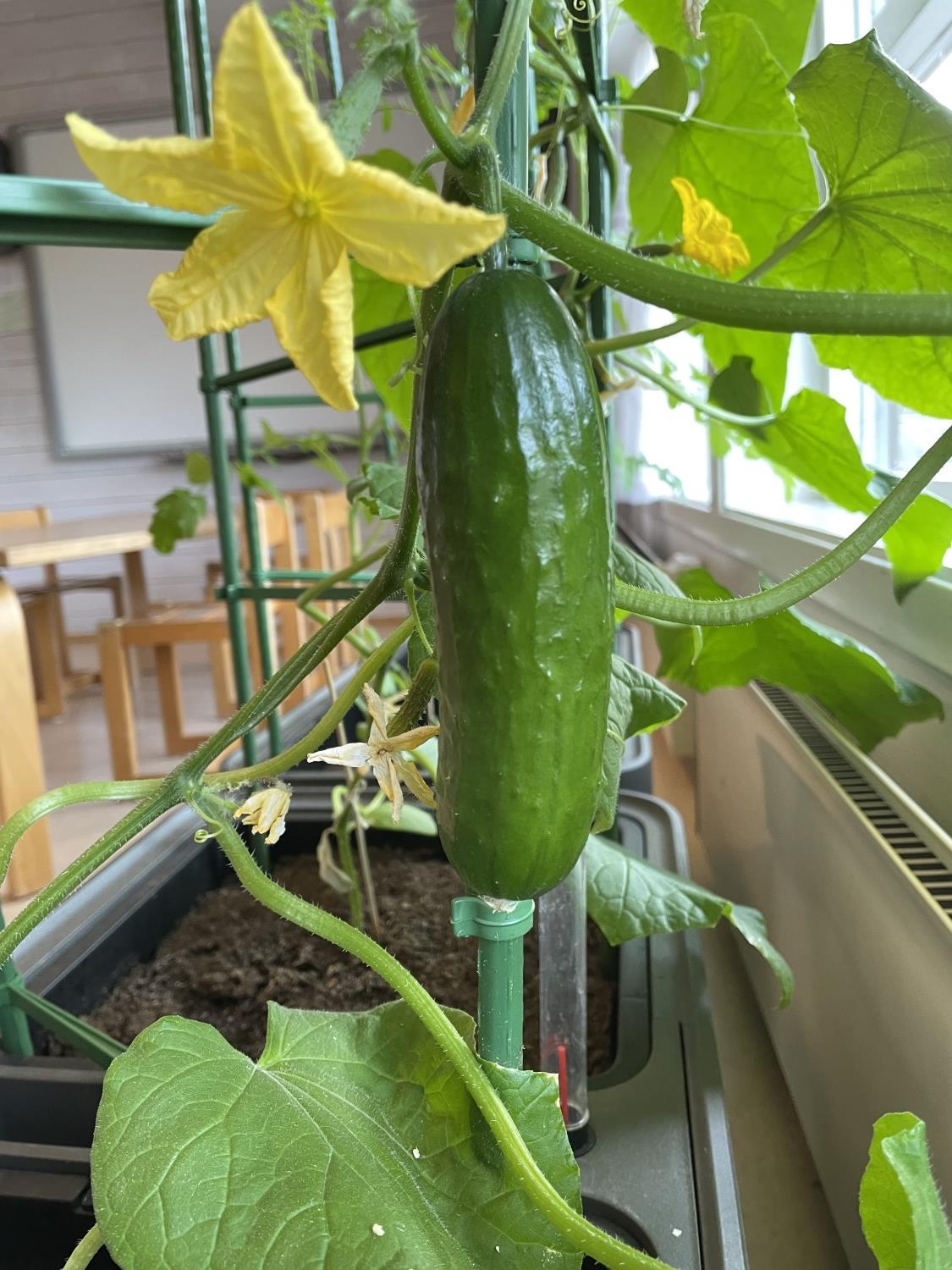 Tomatene blir ikke modne før etter sommerferien, men det gjør ingenting for agurkene vokser så det knaker. Allerede i midten av mai kunne vi smake på den første agurken. Den var god! Og det kommer flere og flere agurker, så barn fra andre avdelinger kommer innom for å ta med seg agurker.