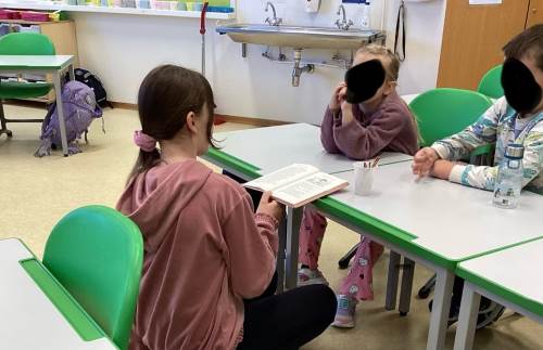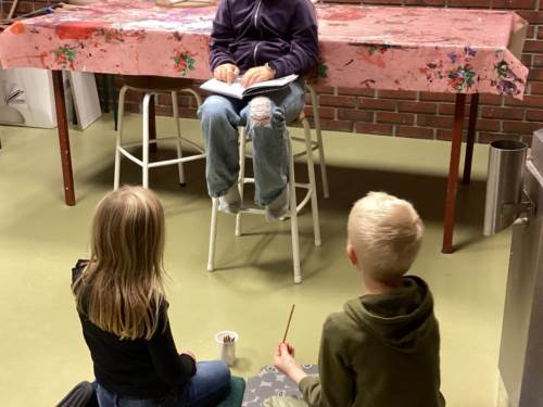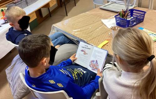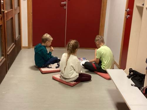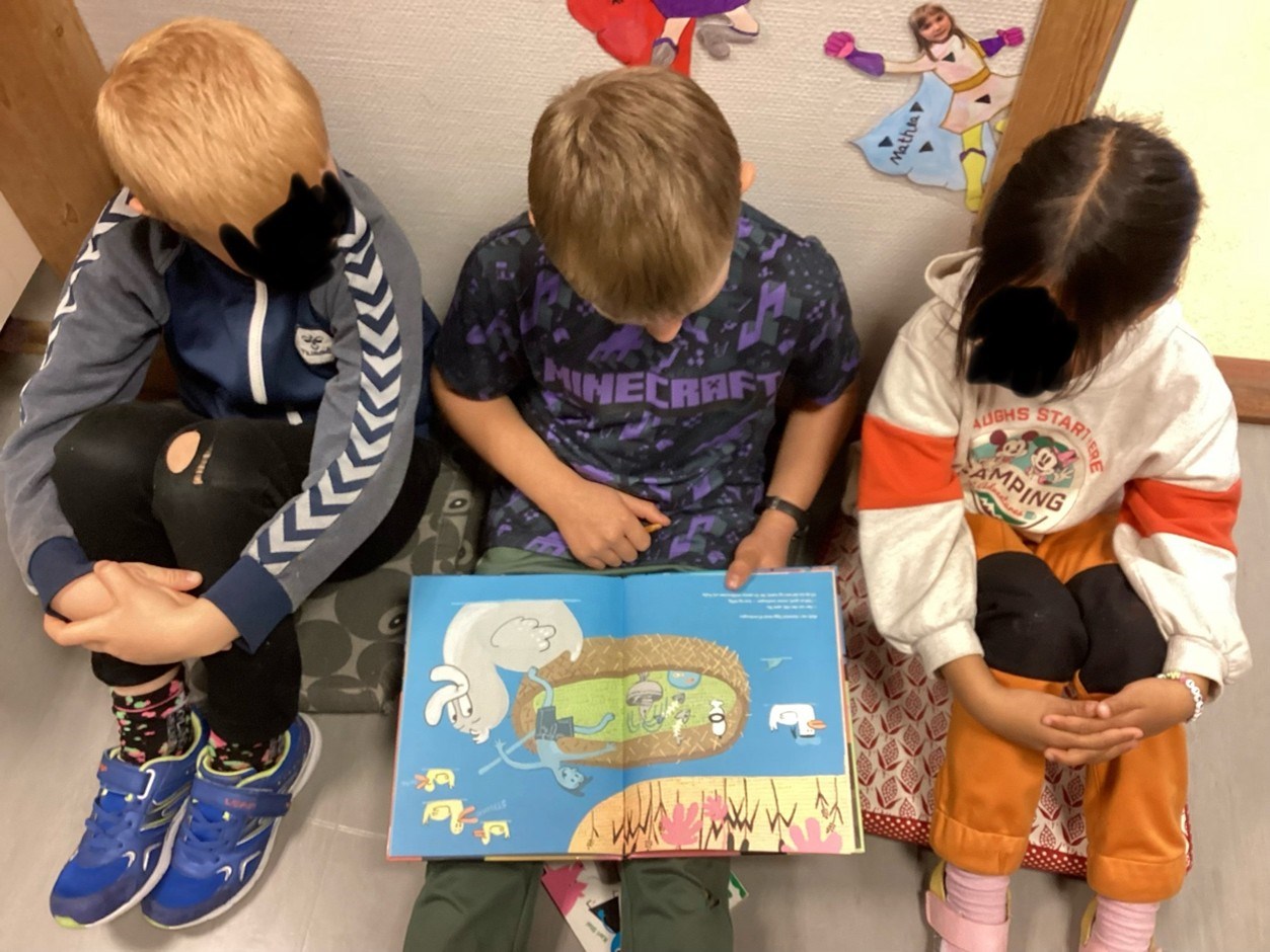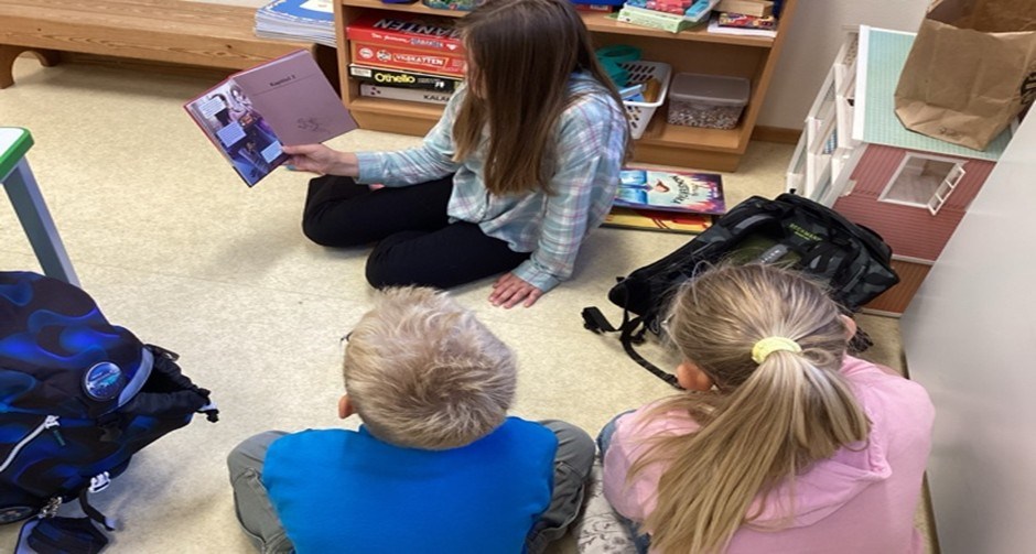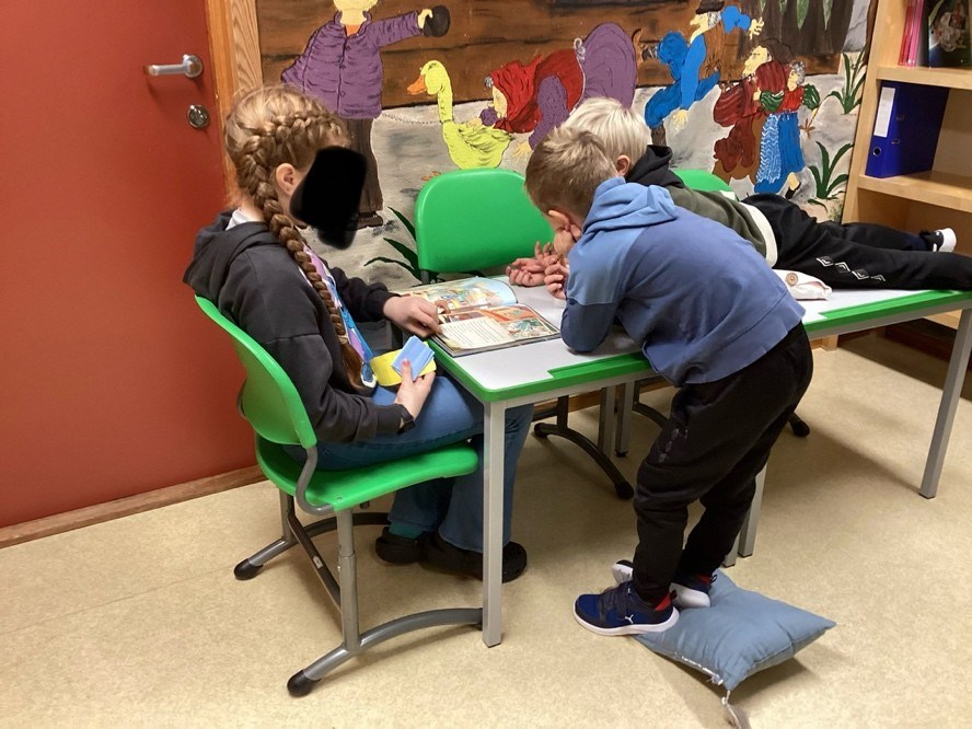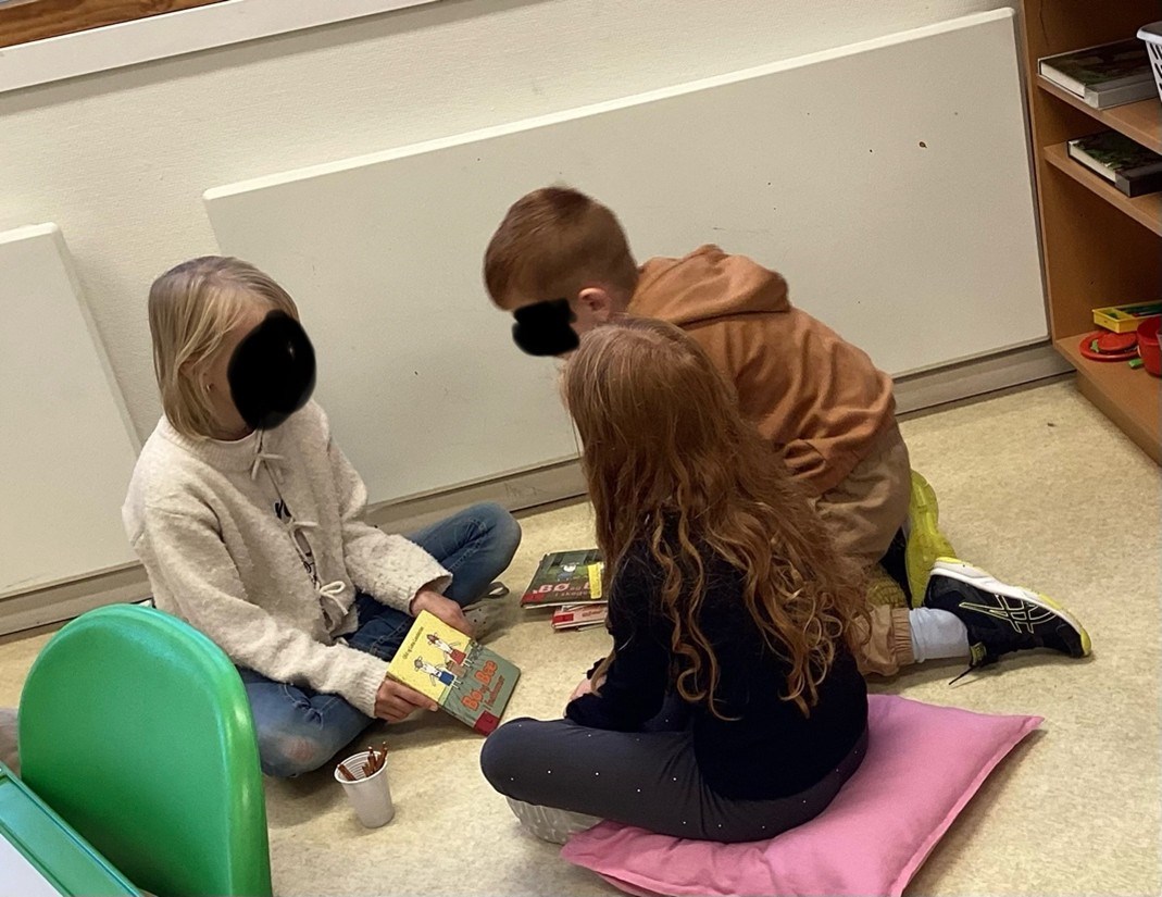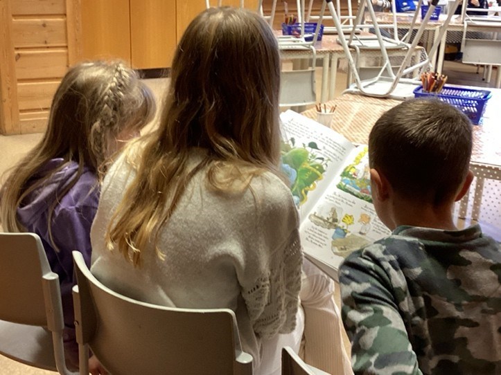Elevar frå 5. klasse les for 1. og 2. klasse. Her er det nokre bilete frå lesinga med 2. klasse i dag