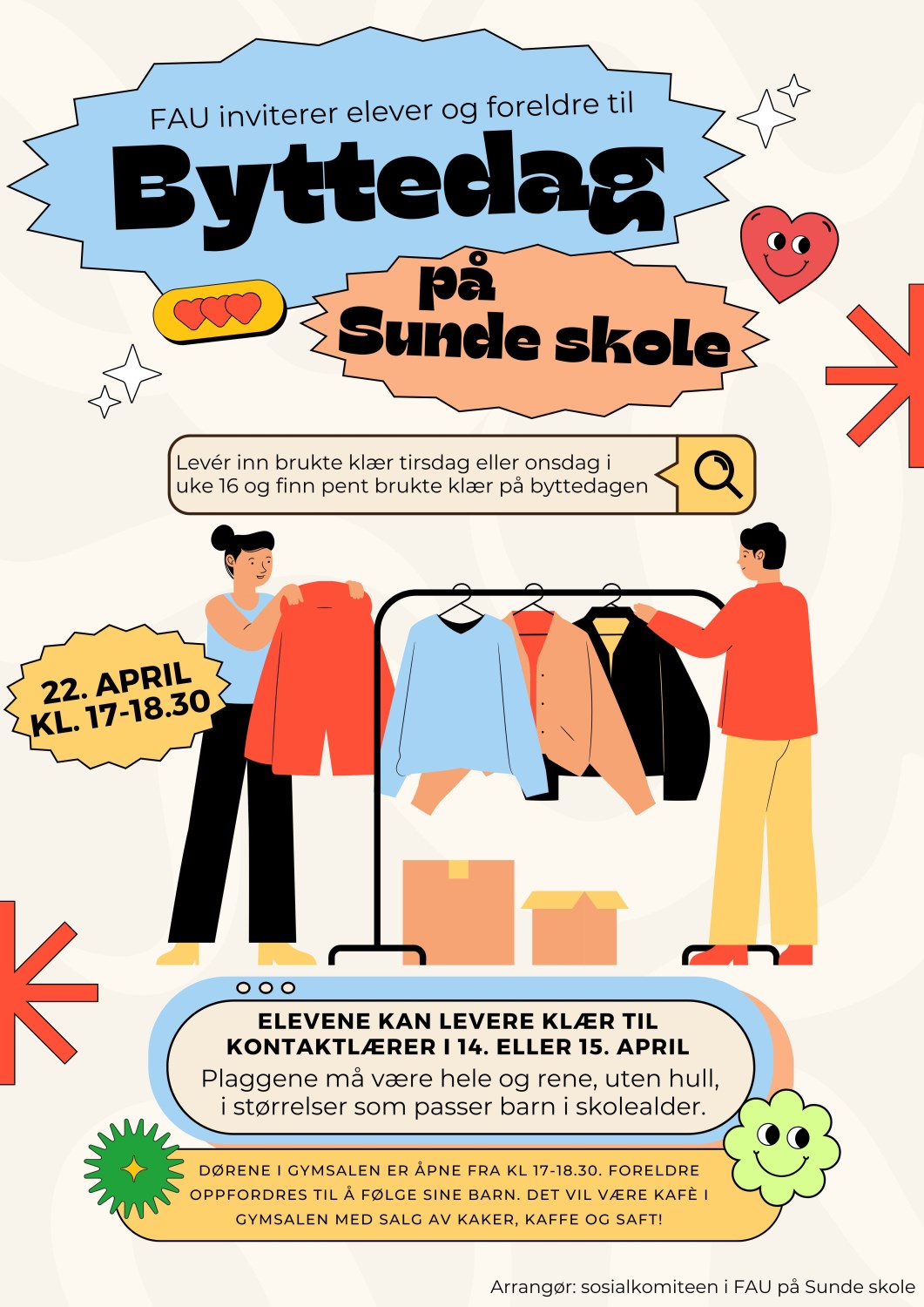 Onsdag 22. april åpner vi gymsalen på Sunde skole fra kl. 17 til kl. 18.30. Her vil innsamlede klær bli lagt frem og alle barn kan finne brukte klær som de kan ta med hjem. Foreldre er hjertelig velkomne til å følge sitt barn.