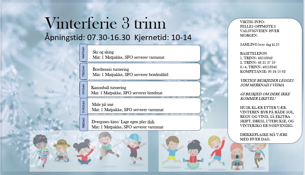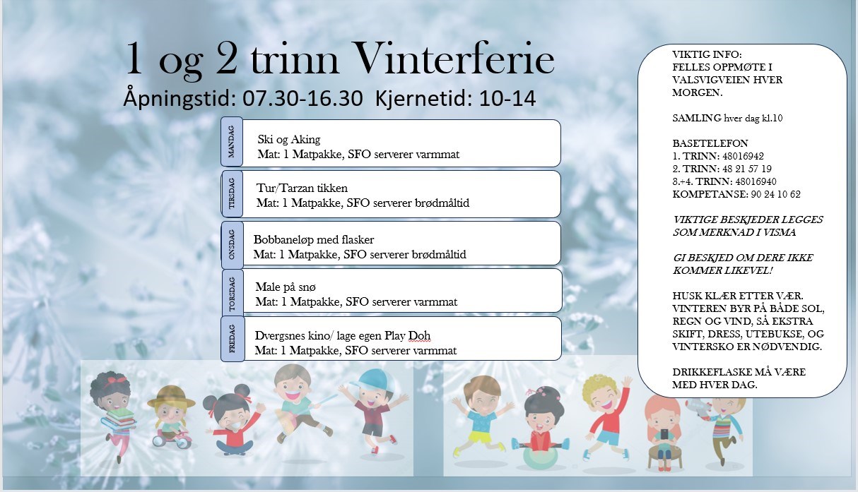 kl.7.30- 8 må de leveres i Valsvigveien og om barna skal være fra kl.16 -16.30