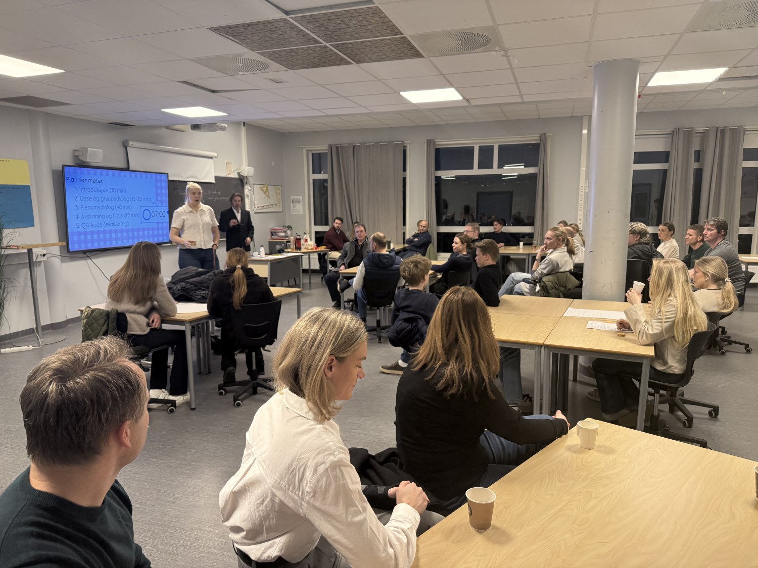 Skolen hadde ulike caser, ut ifra hvilke utfordringer de opplever i sin klasse. Her er vi kommet forskjellig. Noen må jobbe mye med inkludering og negativt språkbruk, mens andre kan fokusere med på å få bedre faglig samarbeid. Kvelden endte opp med at alle forpliktet seg til minst et tiltak for å skape bedre miljø: Lærerne, elevene og foreldrene.