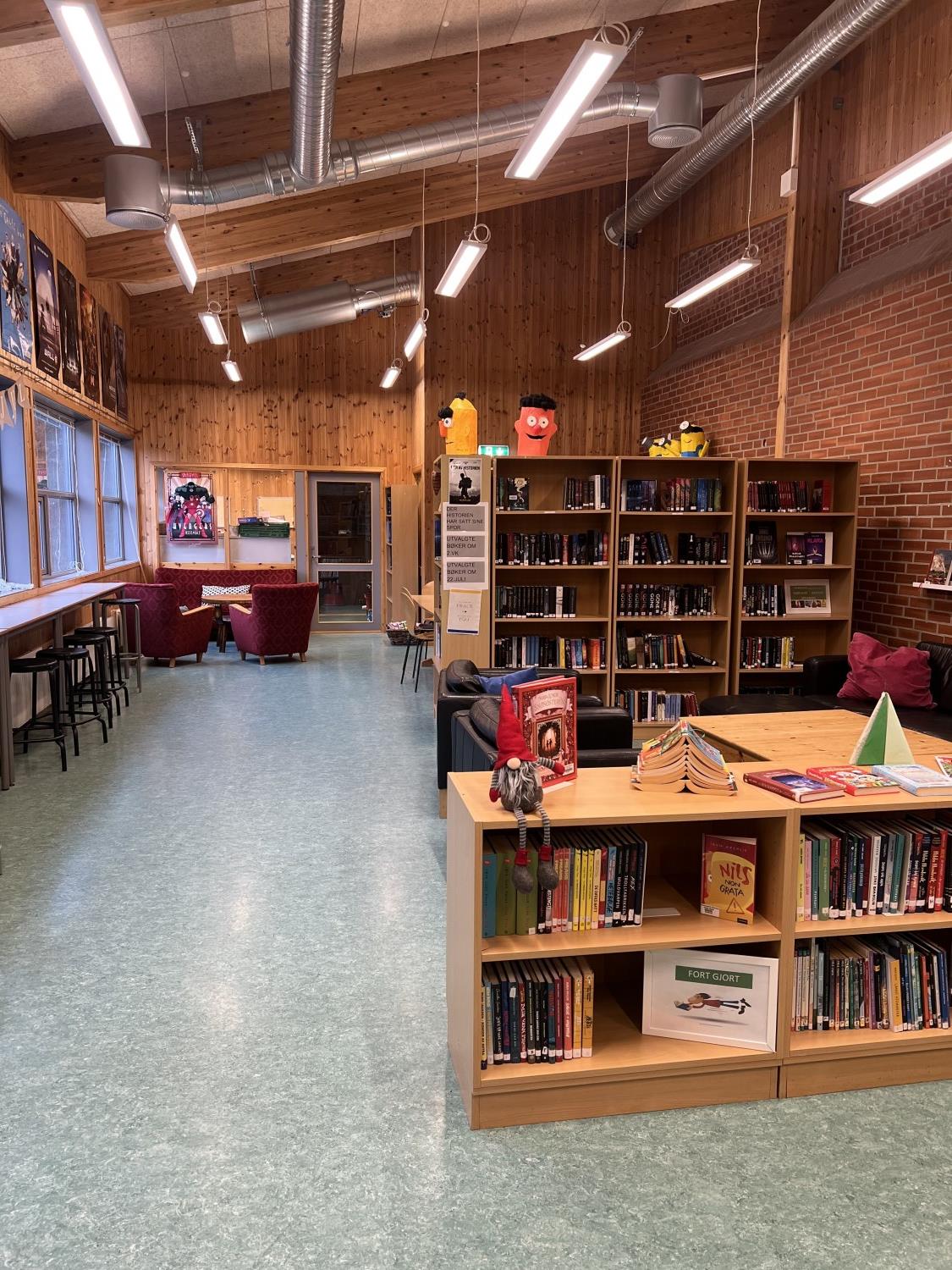 Sammen med gode lærere og fagarbeidere fikk vi inn noen møbler fra andre steder på huset, og biblioteket ble omorganisert. I tillegg ble det noen strøk med maling der pallene hadde stått. Det er flere sittegrupper og arbeidssoner, og et luftig og godt rom å være i. Skulle selvsagt tatt flere FØR-bilder, men tenkte på det for sent. Så her er en blanding av julepynting og før, under, og etter-bilder.