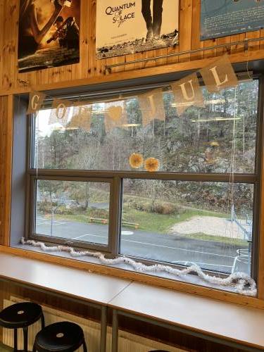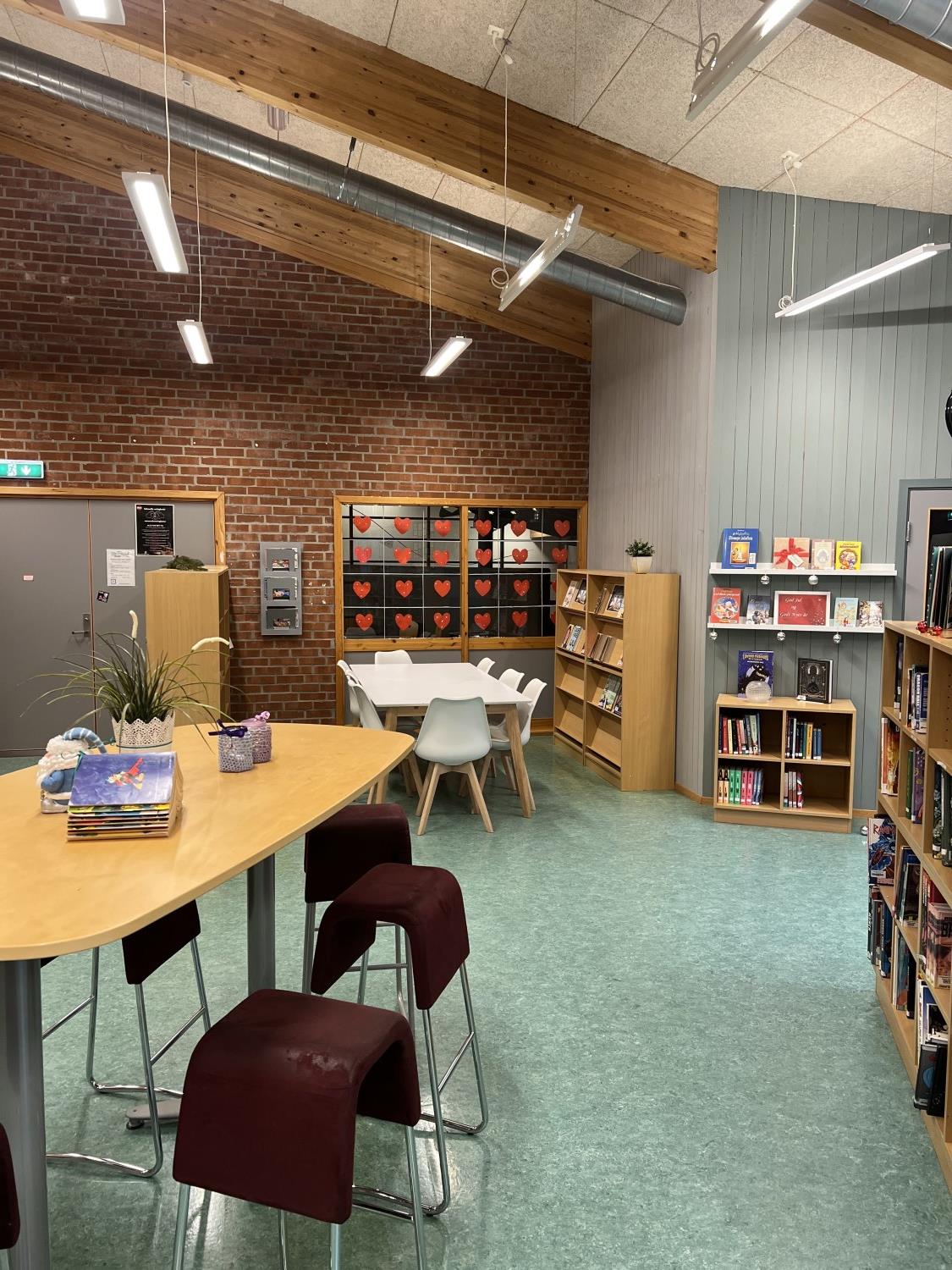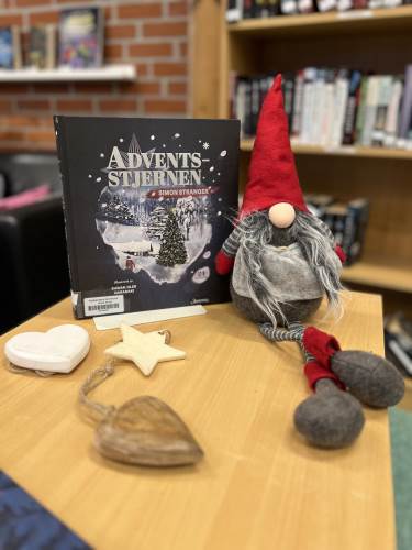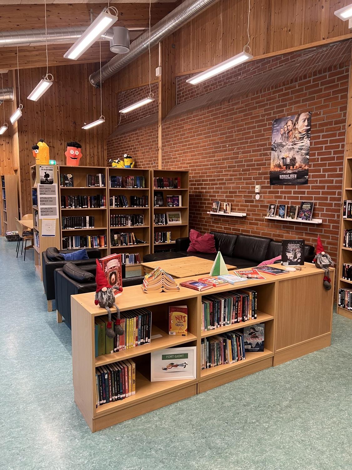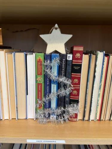 På biblioteket er det også utstilling med julebøker, og elever fra 10.trinn har vært kreative med pyntingen i år.
