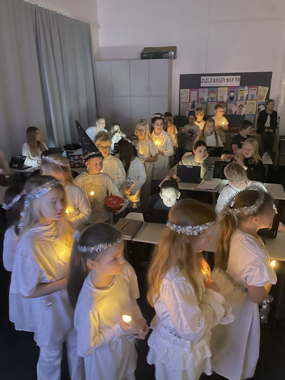 I dag har skolens ansatte tradisjonstro stilt opp på skoletrappa og sunget julesanger for elever og foreldre. Juleferien har derfor snart også kommet til Justvik skole, og da er det naturlig å ta et tilbakeblikk på den siste tiden vi har lagt bak oss. De siste ukene har alle trinn jobbet med temaet skaperglede, med ulike aktiviteter på hvert trinn. Fantasifugler, superhelter, Vinterbyer, ispinnehus, selvgående biler av melkekartonger, byer i Minecraft, tre-på-rad-spill for å nevne noe. Mye faglig arbeid og fokus, men samtidig har vi hatt tid til de tradisjonelle desemberaktivitetene som rød dag, Lucia-tog og fellessamling. I dag avslutter vi med grøt i klasserommet.