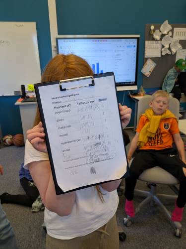 Onsdag 29. april arrangerte skolen Grønn dag, der alle trinn bidro til å rydde og gjøre nærmiljøet vårt litt renere og hyggeligere. Elevene ryddet sammen med lærere og fagarbeidere ulike områder i og rundt skolen – en viktig innsats både for miljøet og fellesskapet. 4. trinn lagde statistikk av sine funn.