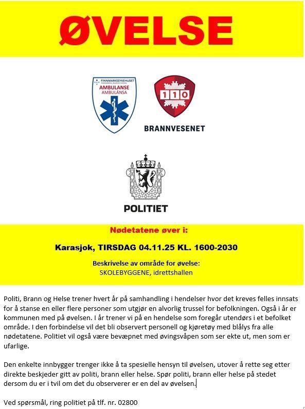 Tirsdag 04.11.25 skal nødetatene og kommunen øve ved skolebyggene og idrettshallen fra kl 16.00 - 20.30.