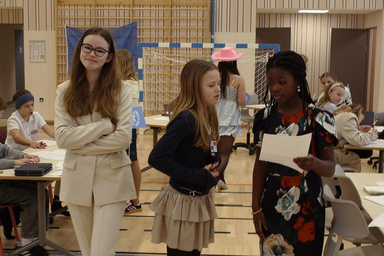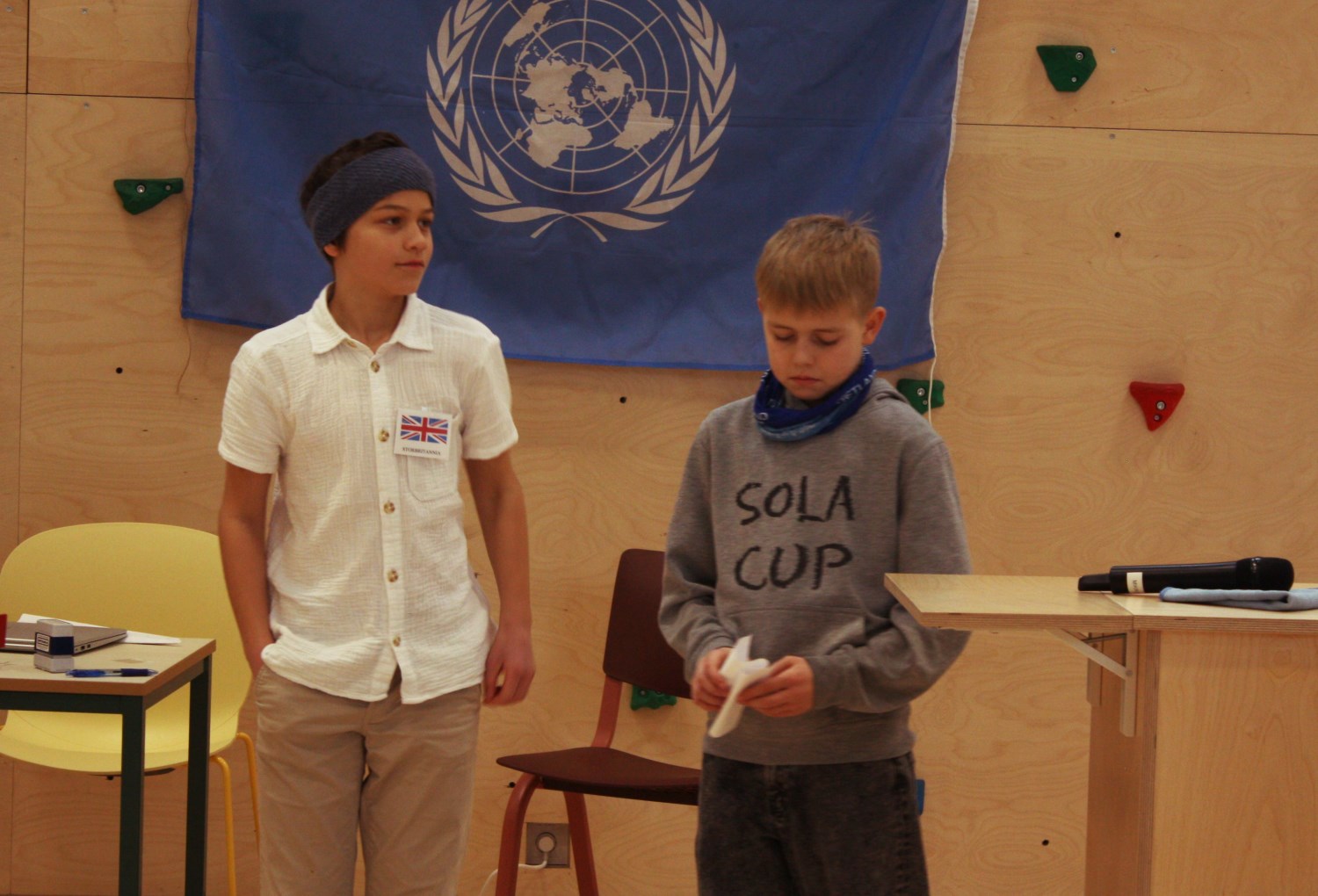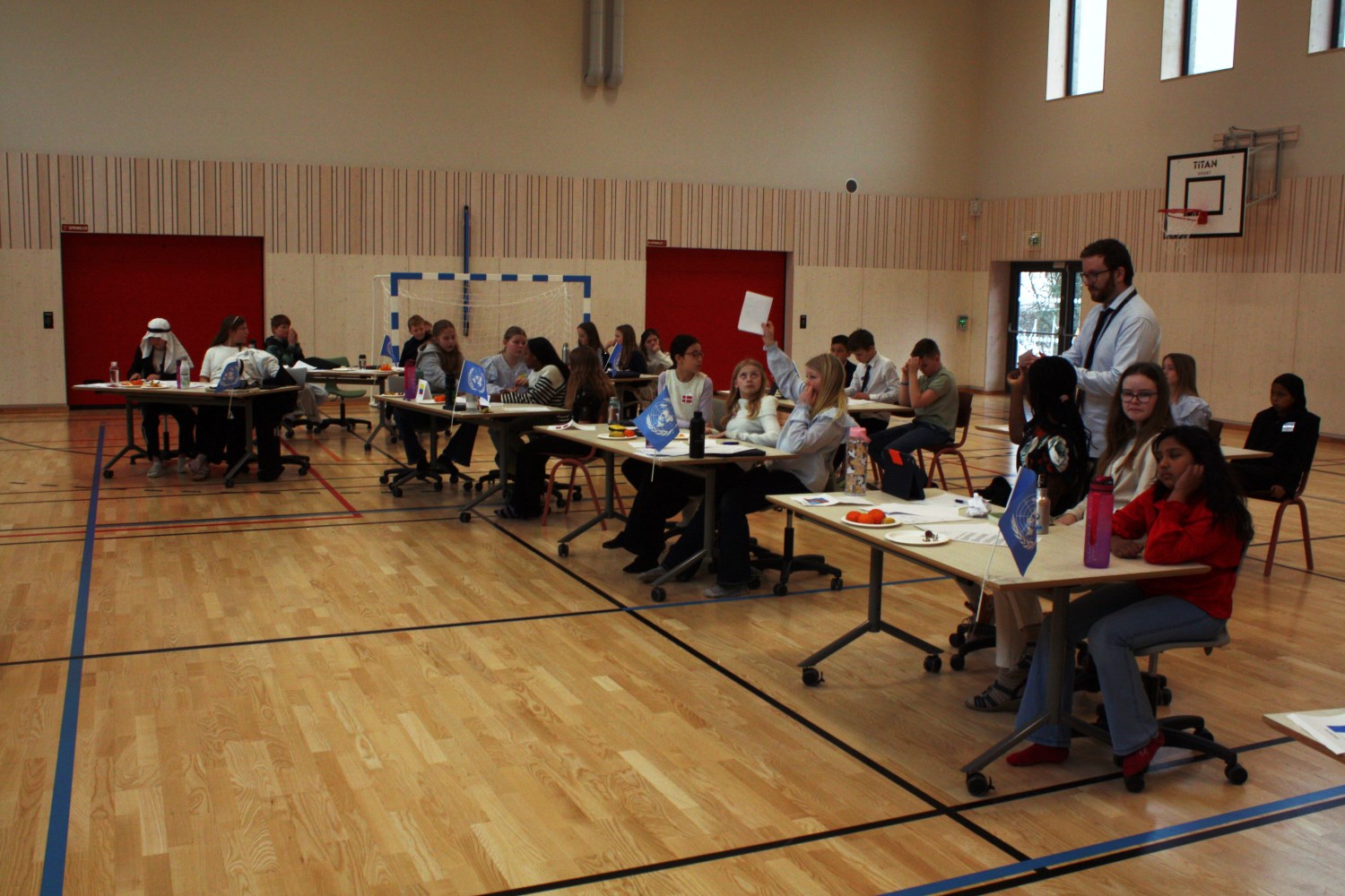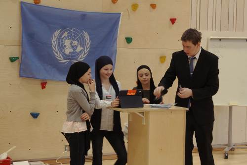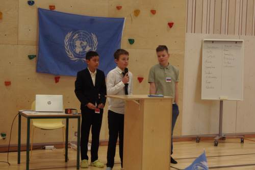 I dag vart det gjennomført FN-rollespel på 6. trinn i gymsalen, etter fire veker med førebuing. Med namnelappar, frukt, kjeks og Non Stop. Det var ein veldig vellykka dag, med mykje engasjement, brevsending, resolusjonar og kontraktar. Fleire resolusjonar vart stemde fram til slutt, og kanskje ikkje alle land er like nøgde med resultata. Nå er det berre å gle seg til neste års FN-rollespel, nå som me har vorte nokre erfaringar rikare.