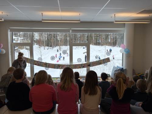 Turid Thorsen var på plass og rommet var pyntet med ballonger. Det var skikkelig god stemning i 3. trinnsrommet, da sjefen selv, selveste rektor Oddbjørn kom inn døra. Oddbjørn var buden for å klippe snora og få introdusert alle 30 faktabøkene, laget av 3. trinn. Hvert barn reiste seg når tittel og forfatter ble opplest av Turid. Barna fikk stolt motta applaus av rektor og resten av klassen. Videre feiret vi med kake og "Kompani Ord". En velfortjent avslutning på 2 ukers hard jobbing.