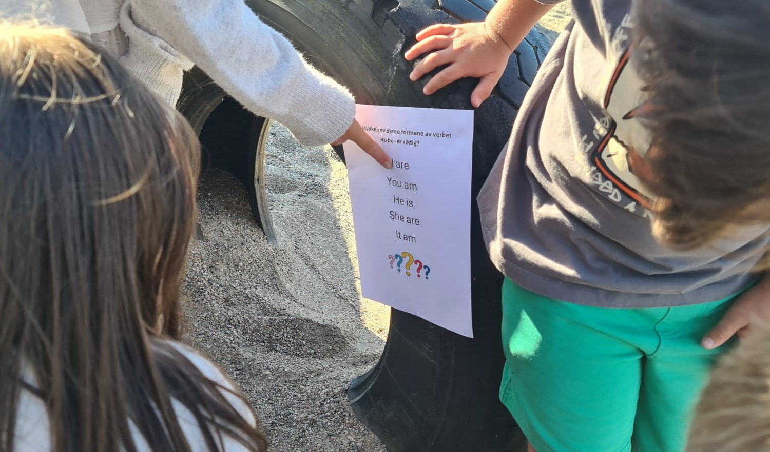 Torsdag gikk vi rundt i skolegården og fant poster med ulike spørsmål på som vi svarte på i mindre, samarbeidende grupper på tvers av trinnet
