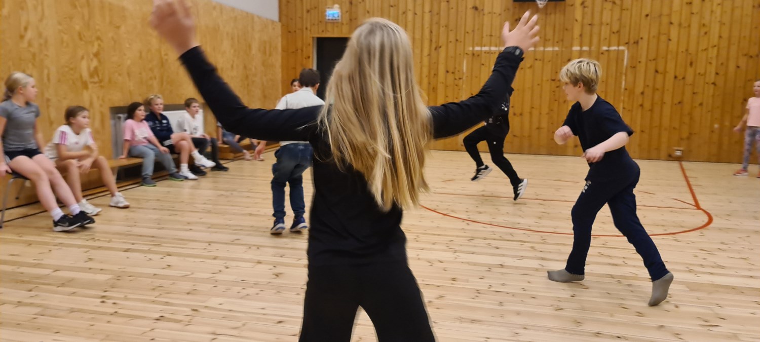 Iherdig innsats og høyt aktivitetsnivå med innebandy og basketball i kroppsøving.