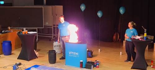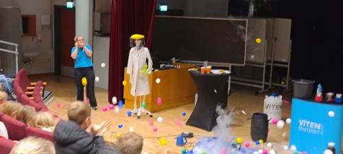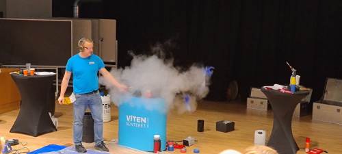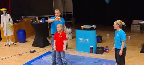 Vi startet med å se et forrykende vitenshow med kjemiske reaksjoner, eksplosjoner og røyk. Tre av jentene fikk nærkontakt; to på scenen og ei med kopp på hodet i setet. Imponerende!
