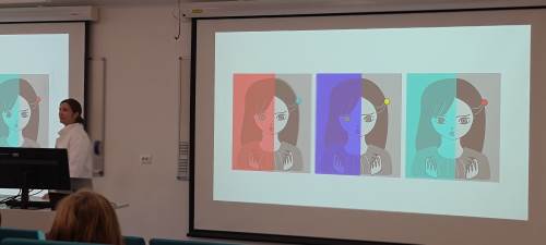 Under foredraget om hjerneforskning fikk vi høre om nevroner, og at vi har så mange i hjernen at vi knapt får til å si antallet. Vi opplevde også hvordan hjernen kan "lure oss" til å se farger når de egentlig ikke er der...