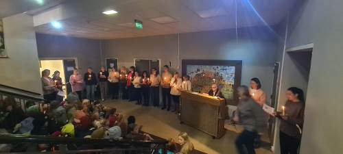 Mandag morgen kl 08.10. Skolens voksne med tente lys og stjerner i blikket utenfor Aulaen. Det er advent og julesang i trappa.