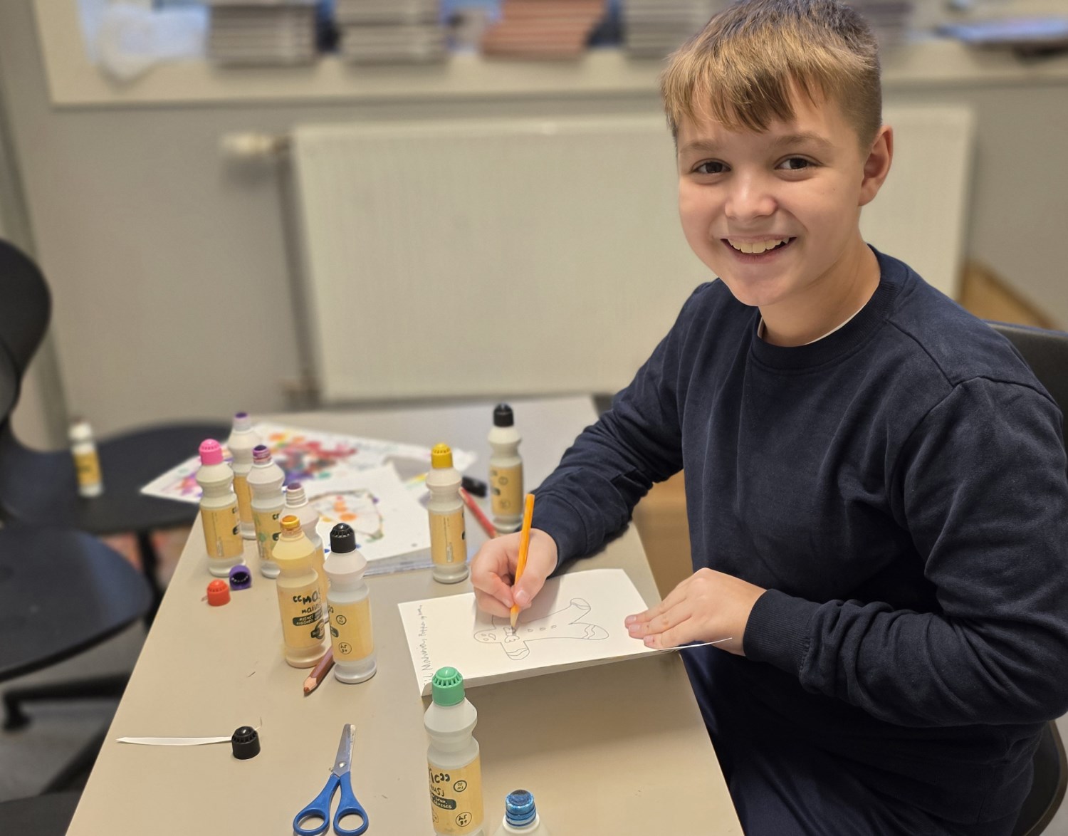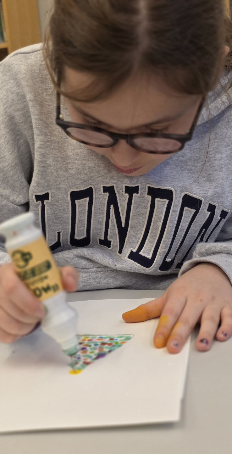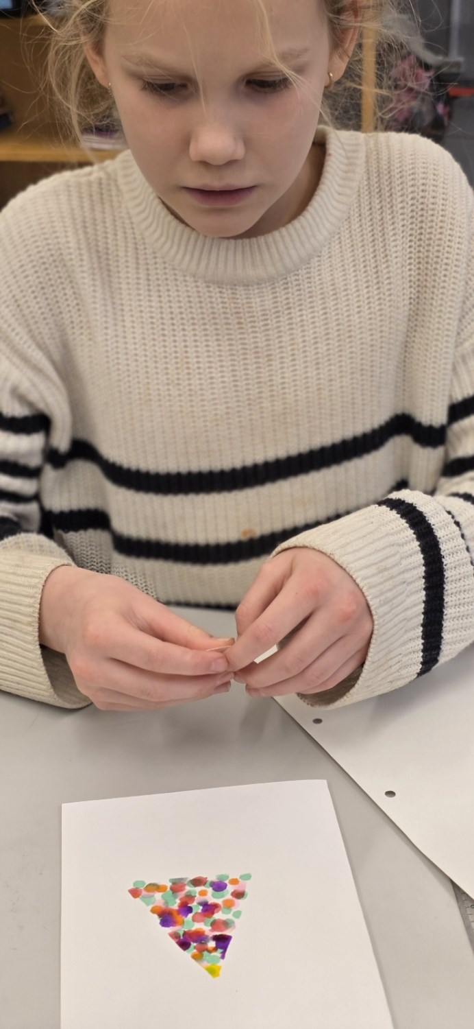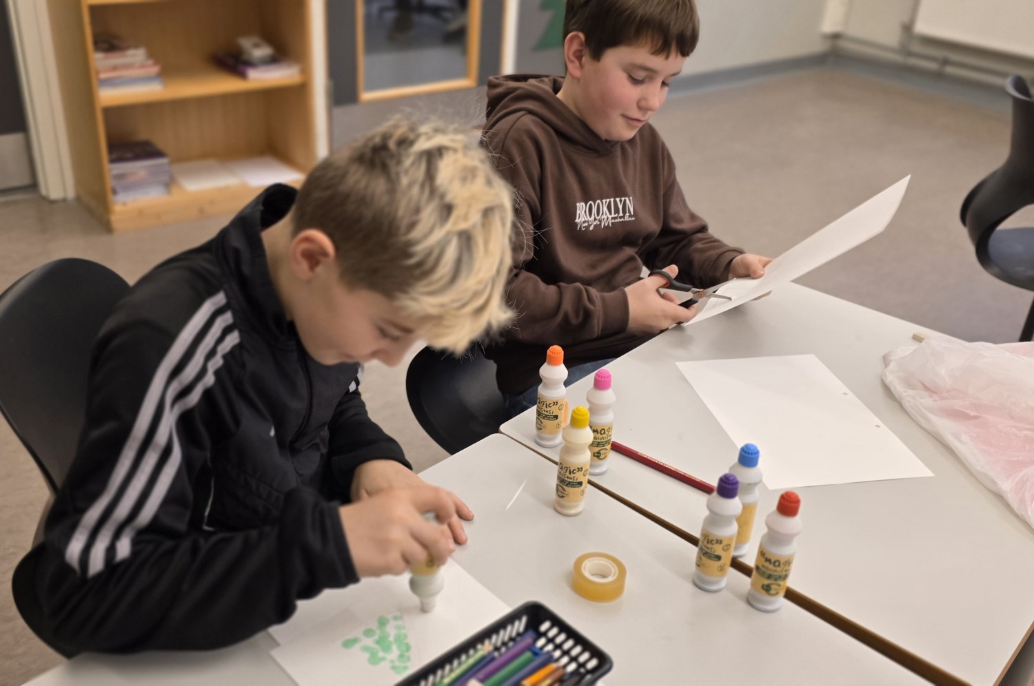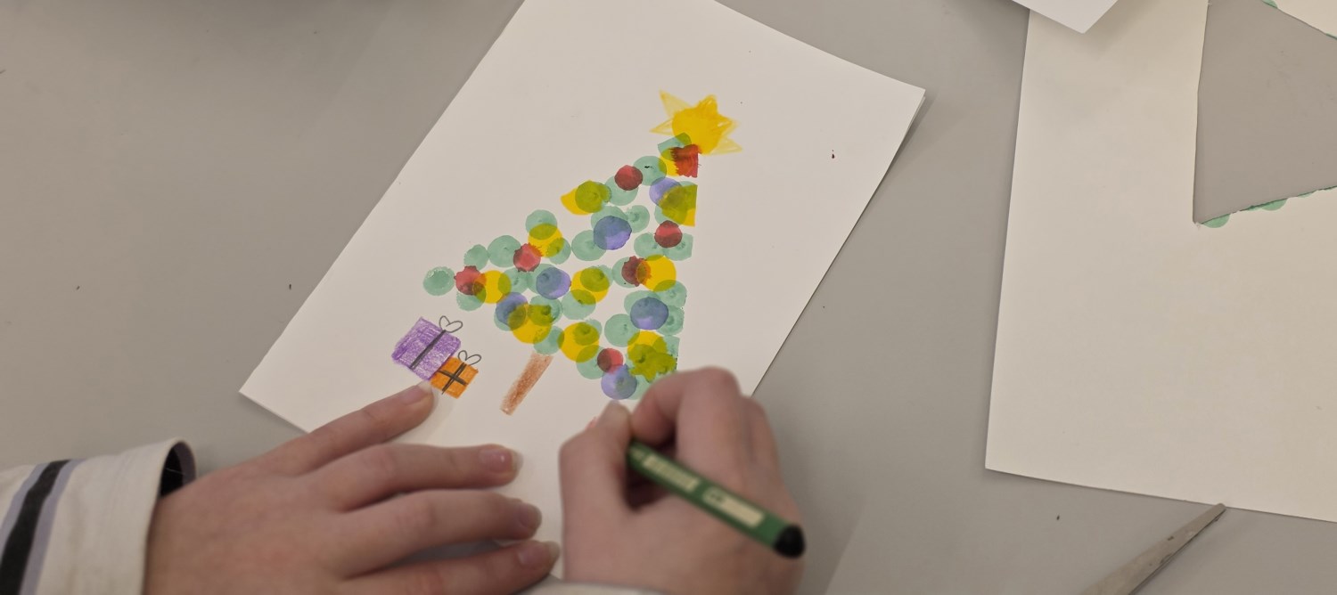 Gruppe 2 lagde flotte, fargerike julekort med tusjmaling i den siste økta med kunst og håndverk før juleferien.