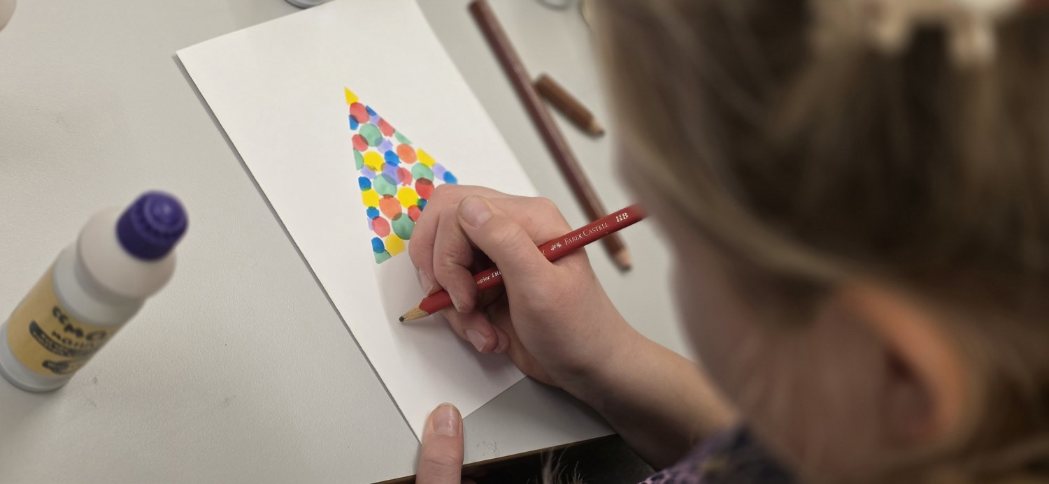 Først klippet vi ut en trekant som en "sjablong". Den la vi oppå selve julekortet før vi fylte den med sirkler av tusjmaling i ulike farger. Vi skrev "Merry Christmas" eller "God Jul" på kortet, og resten fylte vi med tegninger av f.eks. gaver. Kortene ble ordentlig flotte! Tenker noen blir glade for å få selvlagde julehilsner fra den fine gjengen i gruppe 2.