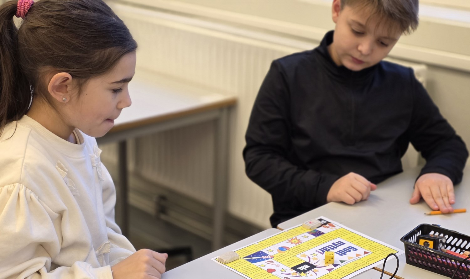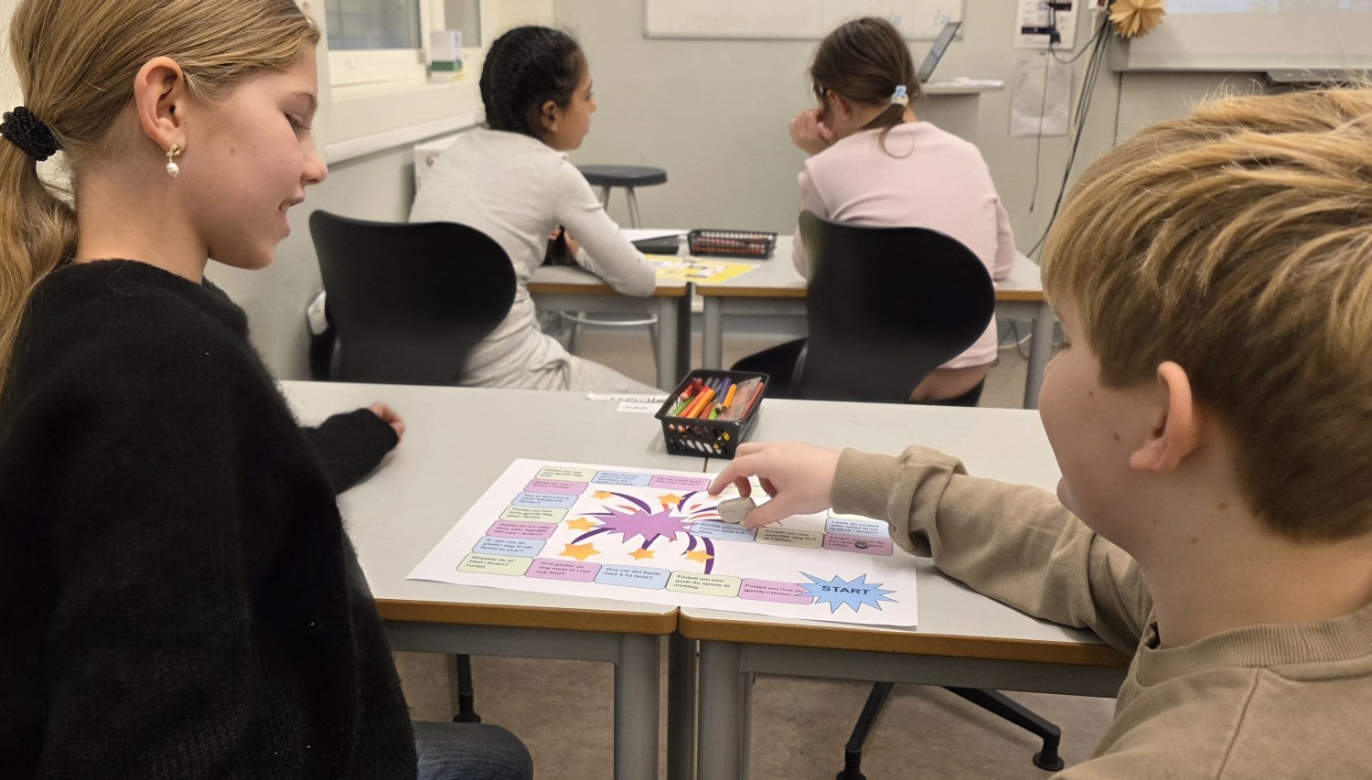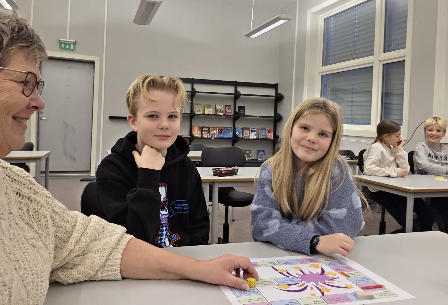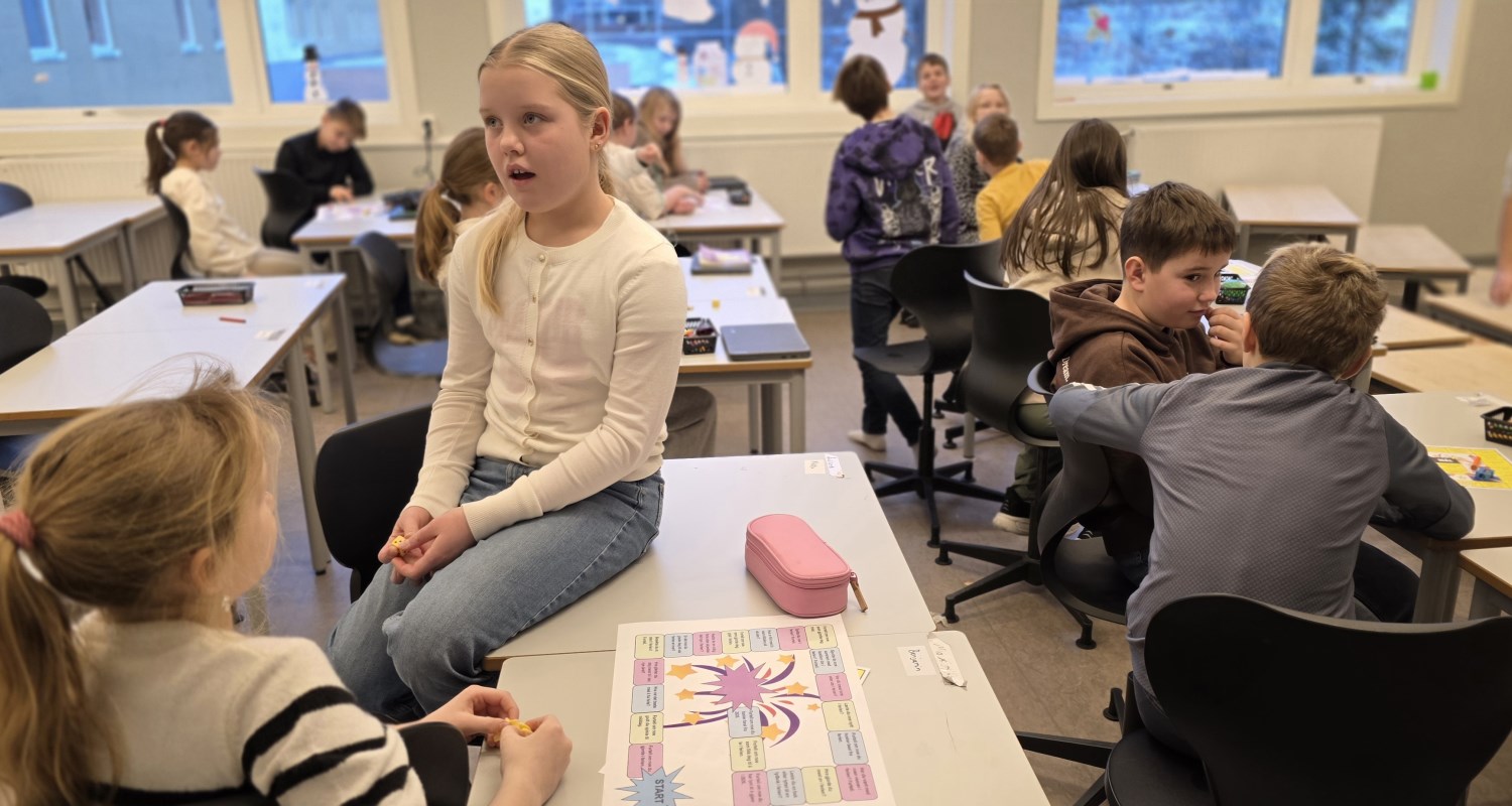 Foruten å skrive om opplevelser i ferien og dele det med hverandre gjennom høytlesning, pratet vi også om det ved å spille nyttårs-spill. I tillegg tegnet vi, hørte på den nye bursdagssangen vi skal bruke for å markere 11-års dager på trinnet, og vi begynte å lage vintervinduer i basen vår. Vi var også mye ute. Da spilte vi kanonball, runsa og akte mm. Det var også kos å spise sammen igjen, og leke sammen i friminuttene! En fin første skoledag etter ferien da vi var sammen både som helt trinn, i 1, 2 og 3-gruppa, og i A, B og C.