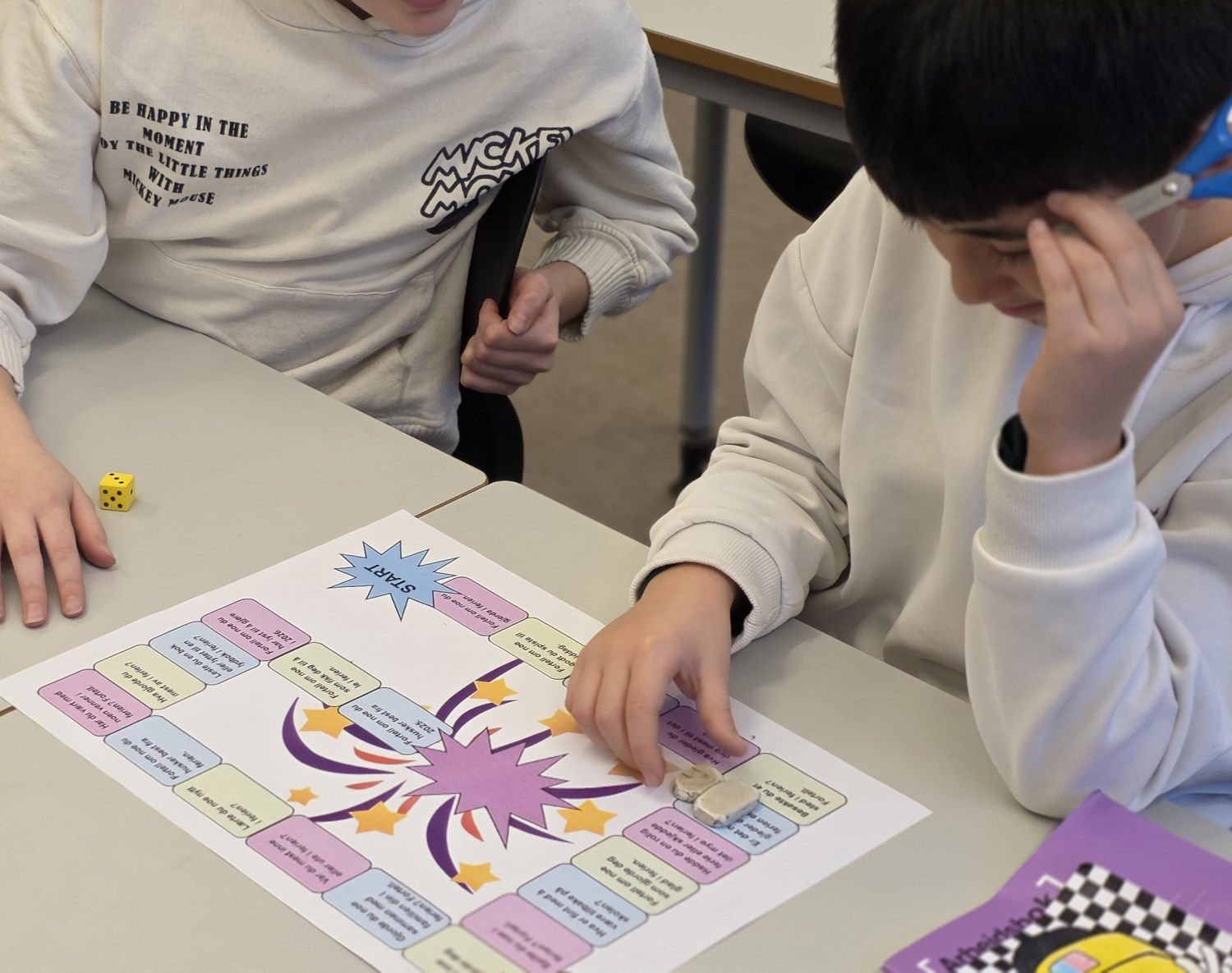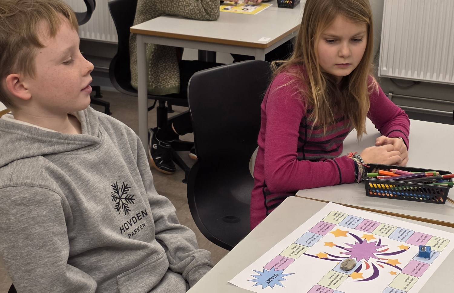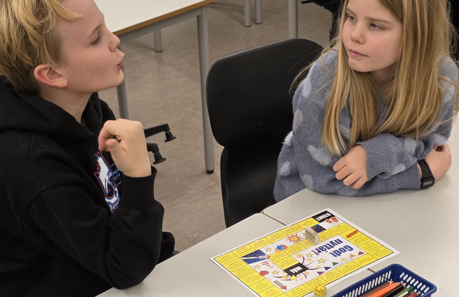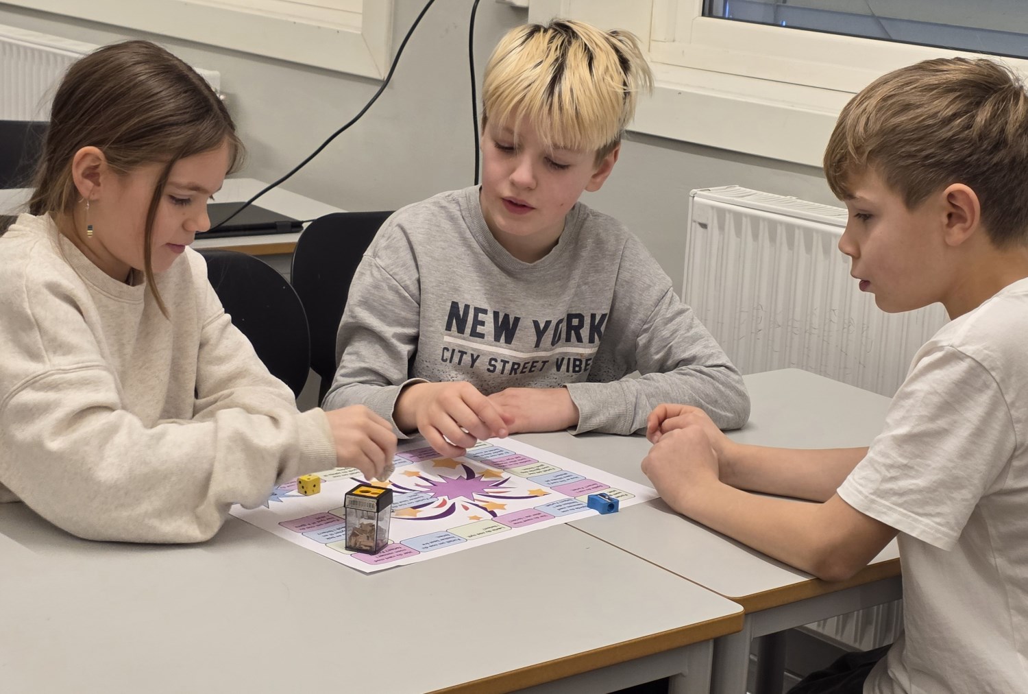 Foruten å skrive om opplevelser i ferien og dele det med hverandre gjennom høytlesning, pratet vi også om det ved å spille nyttårs-spill. I tillegg tegnet vi, hørte på den nye bursdagssangen vi skal bruke for å markere 11-års dager på trinnet, og vi begynte å lage vintervinduer i basen vår. Vi var også mye ute. Da spilte vi kanonball, runsa og akte mm. Det var også kos å spise sammen igjen, og leke sammen i friminuttene! En fin første skoledag etter ferien da vi var sammen både som helt trinn, i 1, 2 og 3-gruppa, og i A, B og C.