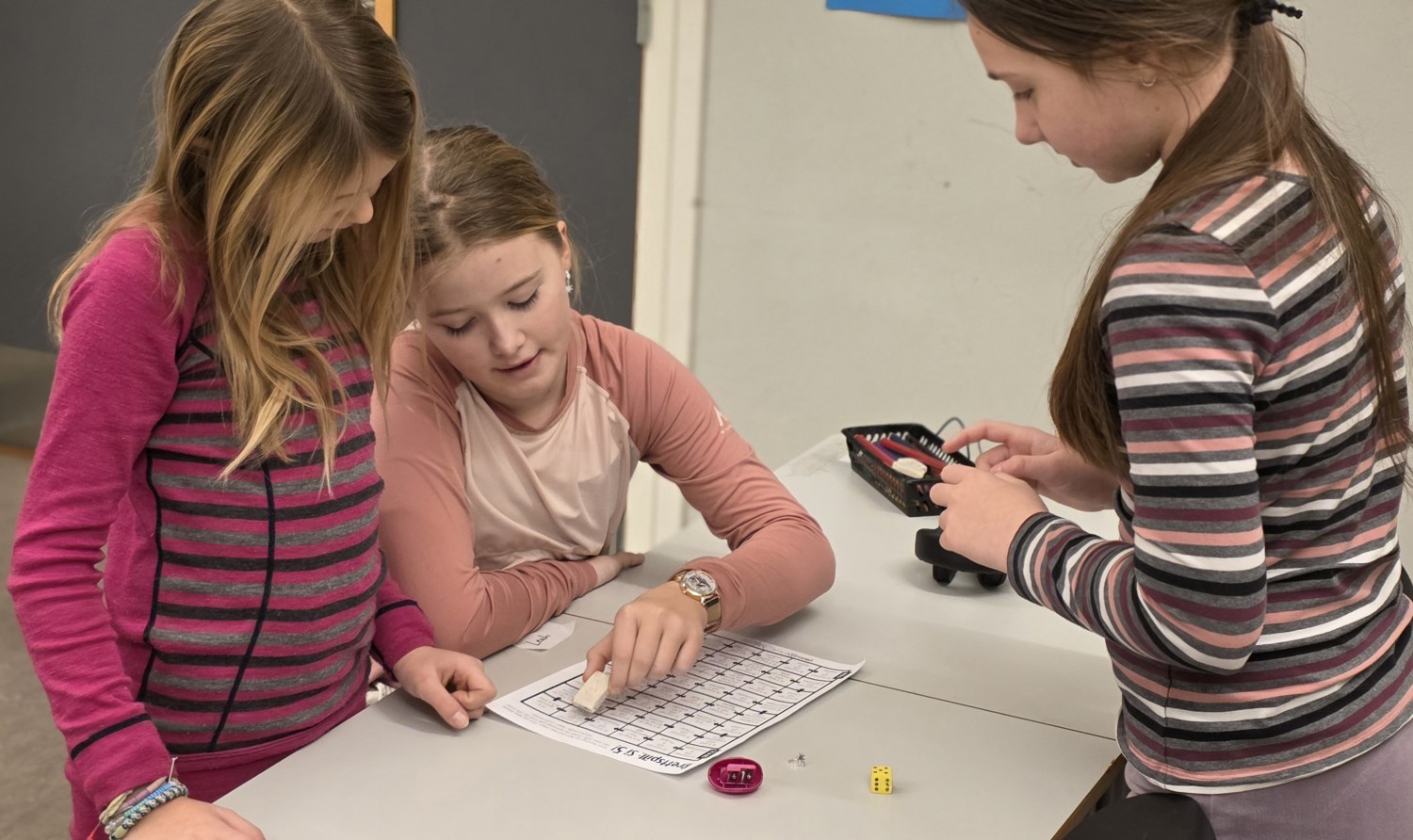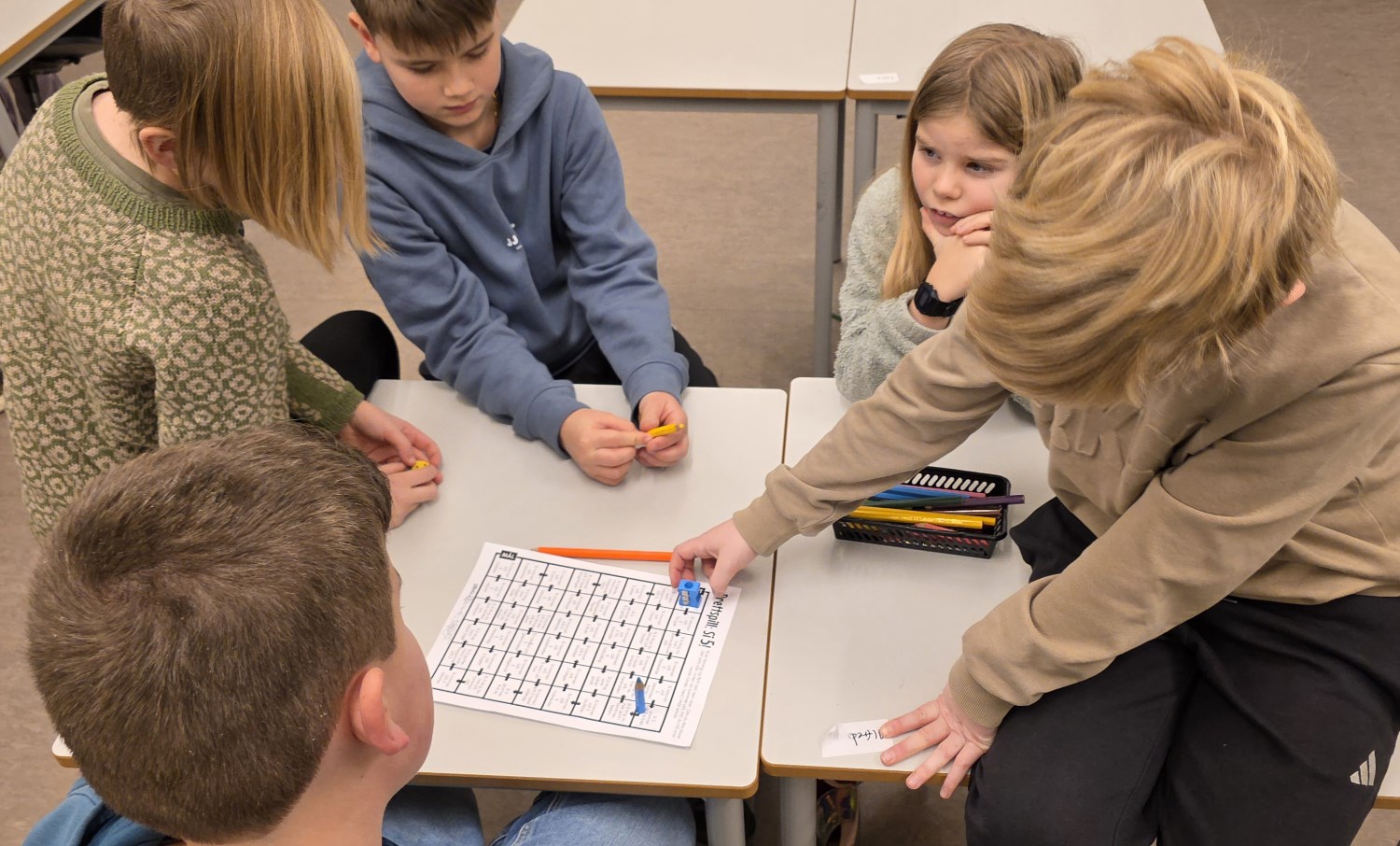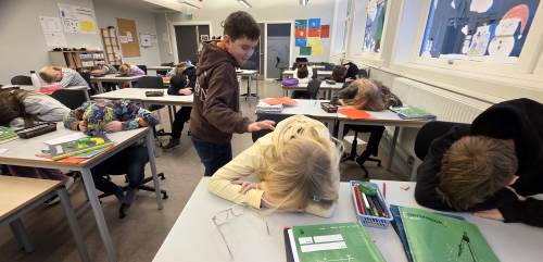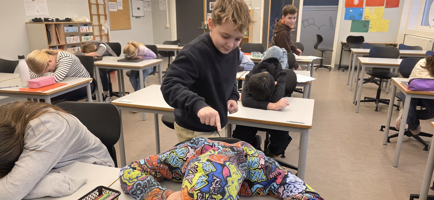 "Prikkeleken" handler om å lytte, se og gjette. Tre elever listet seg omkring i rommet mens resten av elevene lå med hodet på pulten eller satt med øynene igjen. Elevene som gikk rundt prikket hver sin medelev på skuldra før de gikk foran i rommet og ventet. Alle kikket på dem, og de som hadde blitt prikket gikk og stilte seg bak den de trodde hadde prikket dem. Dette ble det mye latter av.