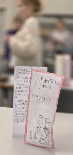 Vi startet opp med å lære om puberteten hos ulike dyr; sommerfuglen og frosken (metamorfose), beltedyret (ønske fra en elev), elgen og maneten, og noe om hunder og katter også. Vi sammenlignet disse dyrenes pubertet med puberteten hos oss mennesker. For å gå mer i detalj om menneskets pubertet fikk vi besøk av helsesykepleierne ved skolen; Maria og Janne. De viste bilder og film, og fortalte om kropper og følelser i endring. Mot slutten av perioden lagde hver elev en informasjonsbrosjyre om puberteten hos jenter og gutter, og vi hadde mini-utstilling av dem i basen vår slik at alle fikk sett hverandres brosjyrer. Foresatte ble også invitert inn i prosessen. Foruten å bidra med hjemmearbeid som å se gjennom kapitlet "Store forandringer" i Solaris og det enkelte barns grensesetting, fikk de i tillegg sett på og lest brosjyren til sitt barn hjemme.
