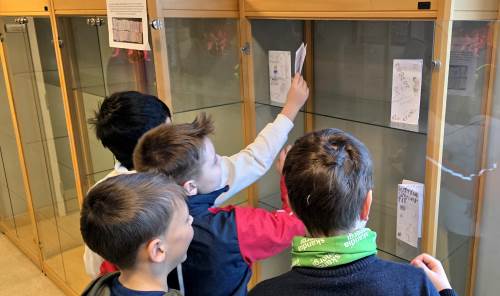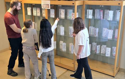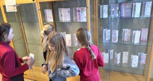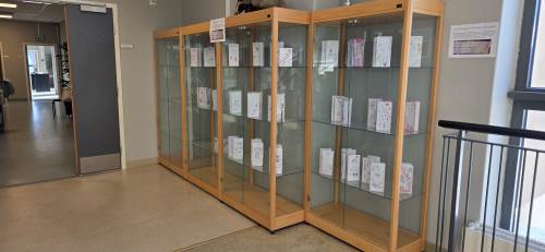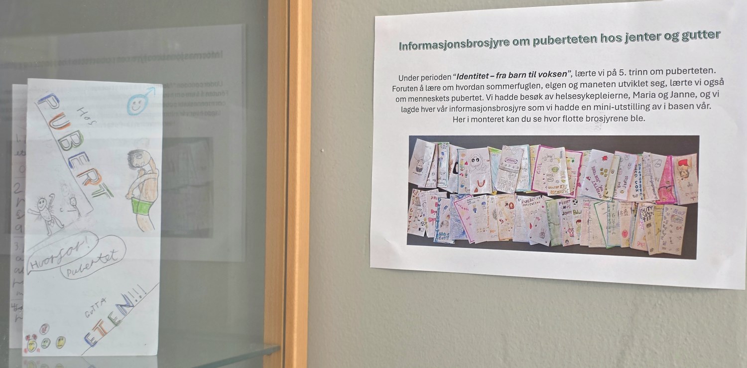 Nå avsluttes perioden med utstilling av informasjonsbrosjyrene i monterne ved administrasjonen. En flott utstilling som elevene selv satte opp i dag; siste dag før vinterferien. Utstillingen blir stående i noen uker slik at alle som ønsker det kan komme innom og se på den!
