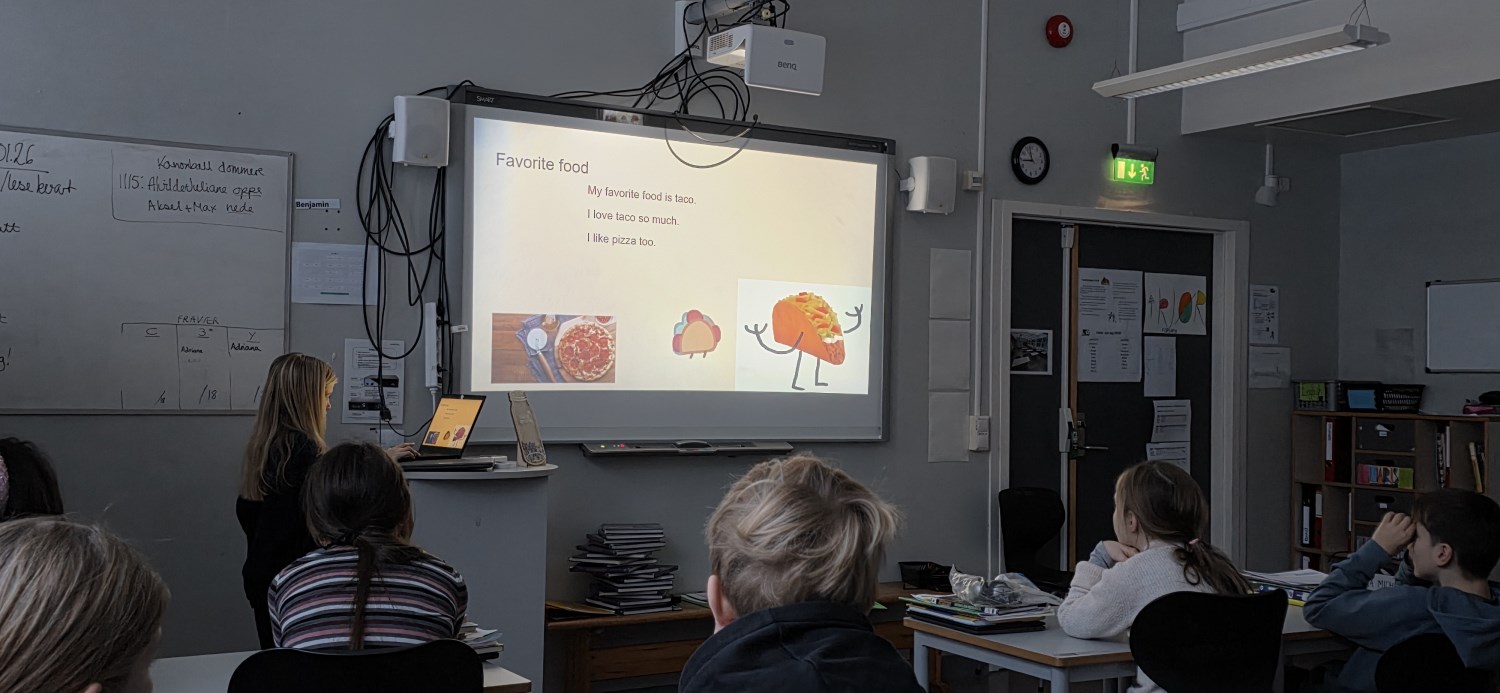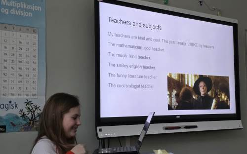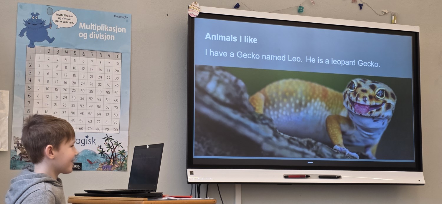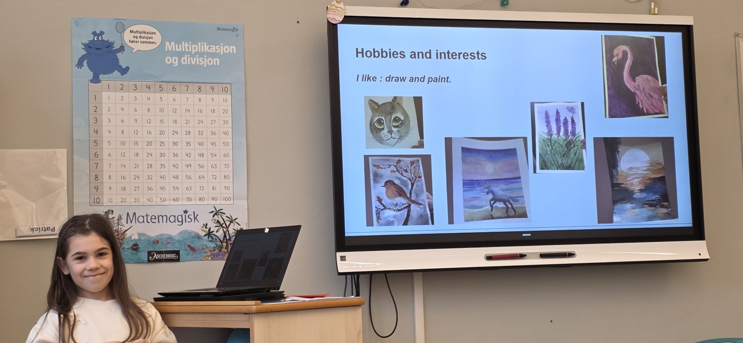 Presentasjonene var innholdsrike. Her var det brukt både ulike teksttyper og farger, bakgrunner og overganger, animasjoner og egne fotografier, og ikke minst fikk hver elev vist frem egen tekstproduksjon. Det mest spennende var nok likevel å stå foran medelevene og fortelle muntlig, hele tiden på engelsk, om seg selv. I forkant hadde alle øvd veldig godt på å fremføre med familien hjemme som publikum, og det var en fryd å høre hver og en i klasserommet! Tilhørerne var skikkelig gode til å gi positive tilbakemeldinger etter hver presentasjon, og alle fikk veiledning om videre arbeid fremover.