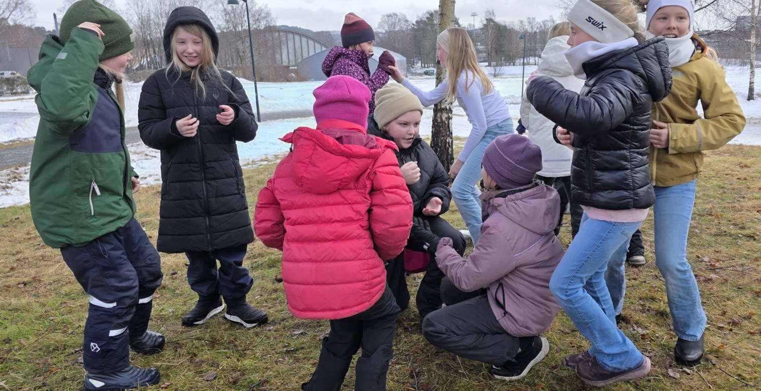 Andrea, Camilla, Kristian og Rune delte oss i 4 grupper med 12-13 elever i hver. De hadde hver sin lekestasjon med dilemmaer, amøbelek, bli kjent-konkurranse og Hi, ha, ho!