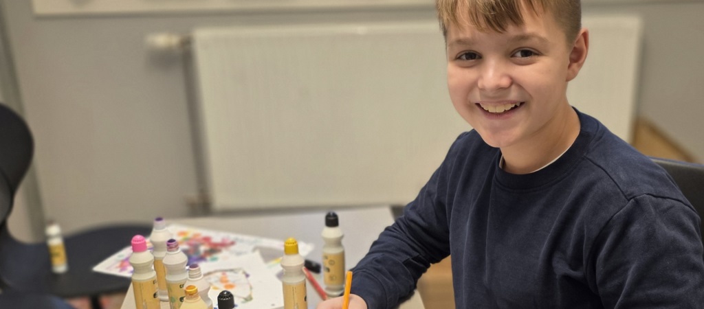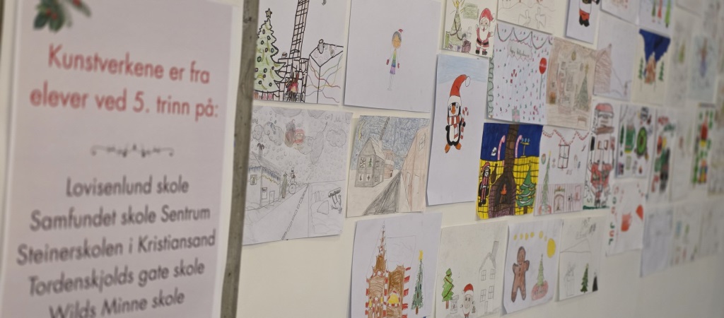 I 1 et på Kristiansand Folkebibliotek kan du se de utstilte kunstverkene i tegne-, og malekonkurransen "Min Drømmejul" som 5. trinn er med på.