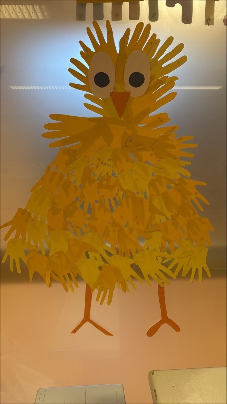 2.trinn : Denne uka har vi hatt fokus på været og hva slags tøy vi burde ha på ute. Vi har samarbeidet om å klippe ut gule hender for å lage en stor påske kylling sammen som vi har hengt opp i vinduet.