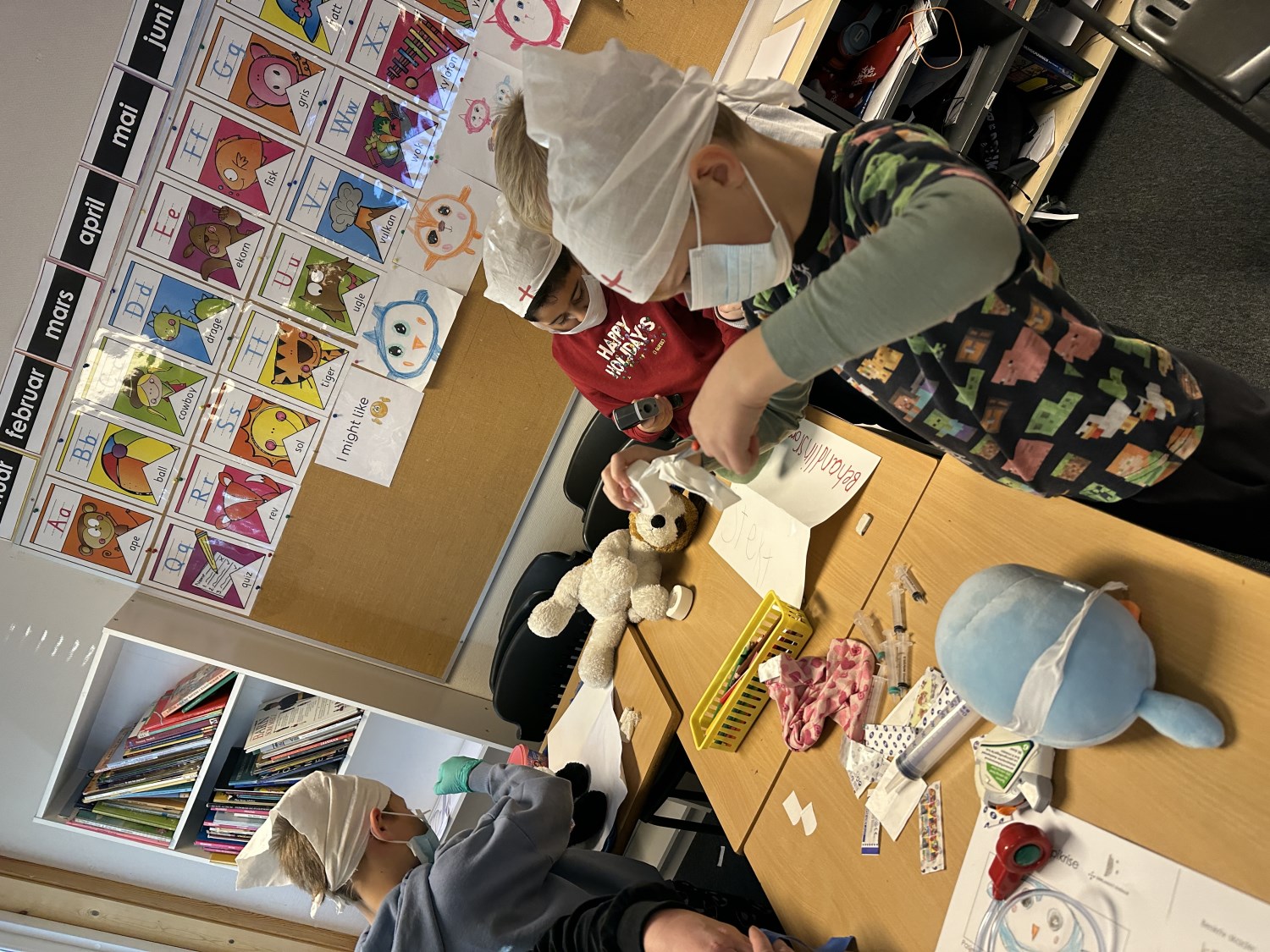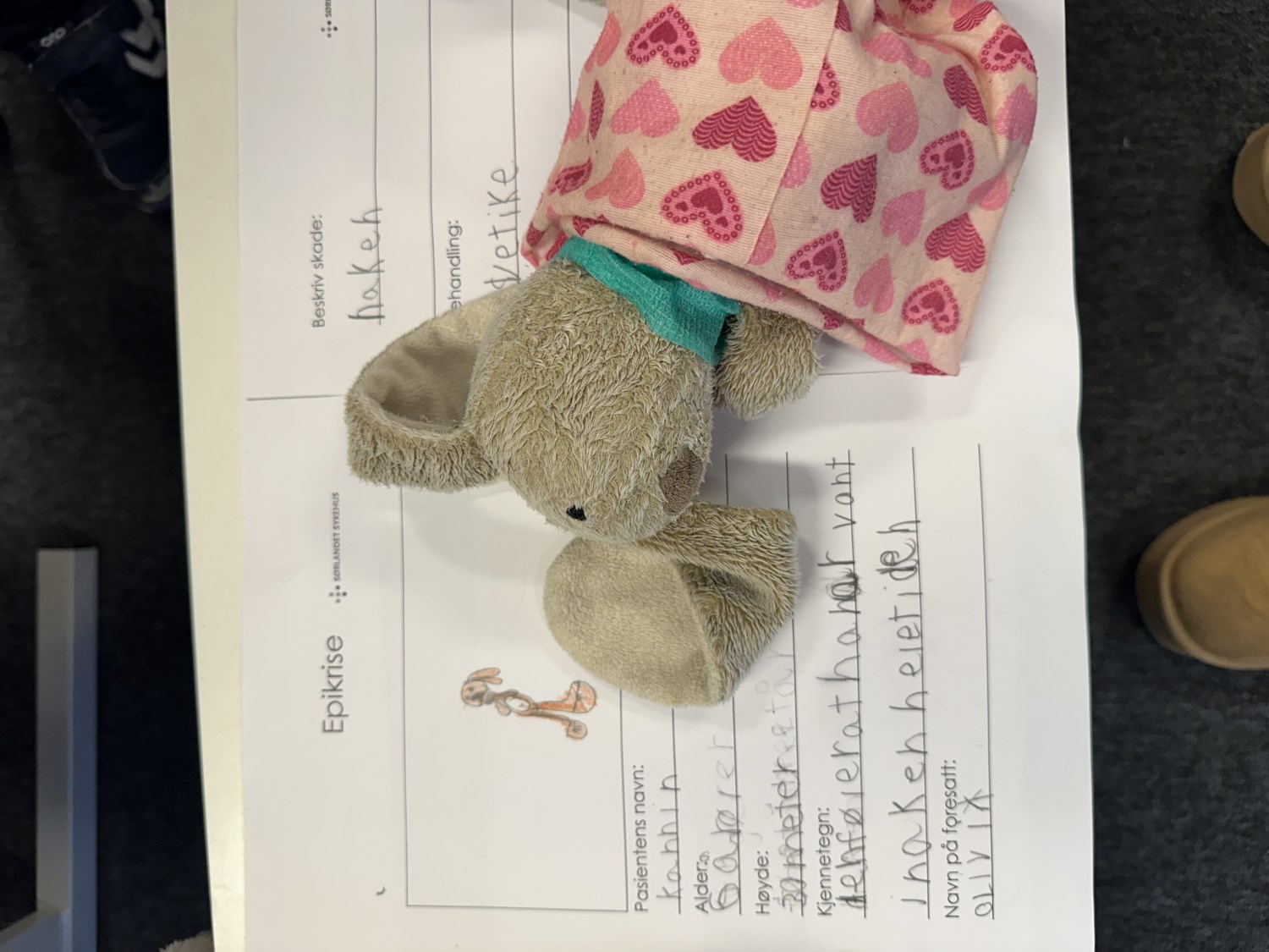 I dag har vi hatt bamsesykehus på 2.trinn. Elevene forberedte dagen i går. De laget plakater slik at vi kunne vite hvor de ulike avdelingene på sykehuset var. Vi hadde venterom, eget røntkenrom, behandlingsrom, undersøkelsesrom og apotek. De fikk lov å omorganisere hele klasserommet og være kreative. Utstyret ble lagt på plass på riktig rom og elevene gledet seg veldig. Fredagen kom og bamsene lå i sekken. Først måtte de lage en EPIKRISE av pasientene sine (bamsene) og notere viktige ting ned slik at behandlingene kunne gjennomføres. Bamsene måtte ta rønktenbilder og gå gjennom undersøkelser for å finne riktig behandling. Det var mange som dessverre hadde brekt noe og måtte ha bandasje. Andre fikk tatt ulike vaksiner og noen måtte gå på sterke smertestillende. Dette fikk de tak i ved å lage en resept og kjøpe på apoteket. Elevene var engasjerte og kreative i sin lek med bamsen. Kjedelig var det når vi måtte avslutte. Vi legger ved noen bilder, kos dere.