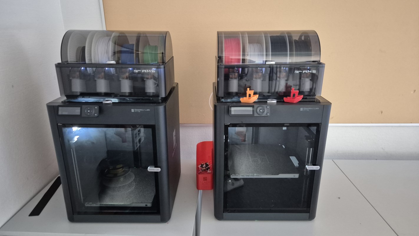 Lynraske 3D-printere med AMS-system som gjør at de kan bytte mellom ulike farger underveis i printen.