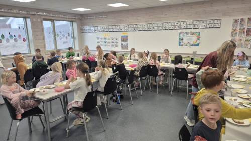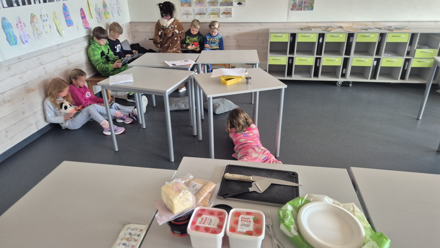 Helt til slutt avsluttet vi hele prosjektet med en kjempekoselig påskelunsj hvor hele trinnet satt samlet og spiste lunsj sammen. Vi øvet på å dele, spørre pent og sende pålegg.