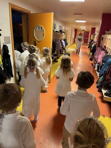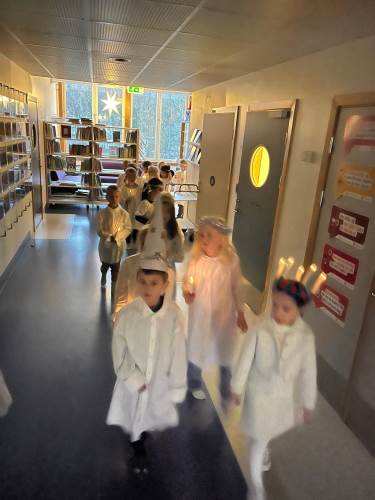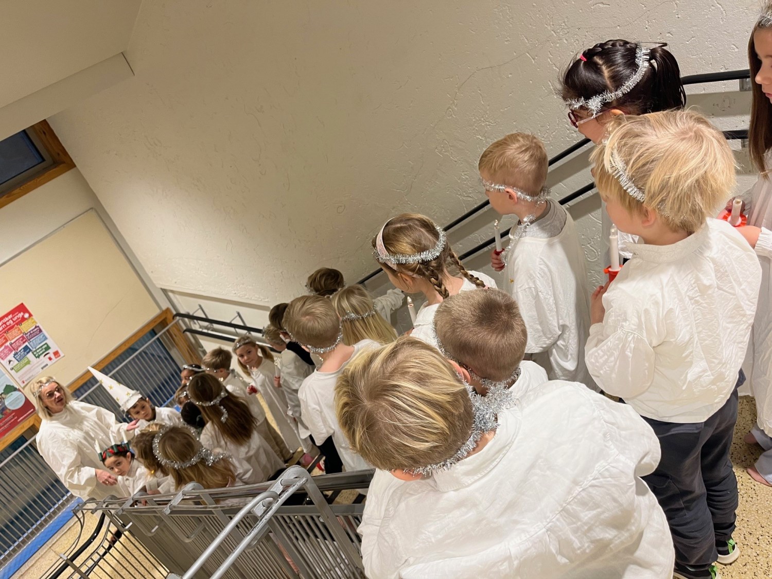 Luciadagen er en fin tradisjon som minner oss om lys i mørketiden, og i dag fikk hele skolen oppleve den. Førsteklasse gikk Luciatog gjennom gangene og inn i alle klasserommene. Barna sang Luciasangen og skapte en varm og hyggelig stemning. Med seg hadde de lys og lussekatter, og alle fikk smake på lussekattene som 6. klasse hadde bakt. Det ble en morgen fylt med sang, lys og fellesskap – en tradisjon som sprer glede til både store og små.