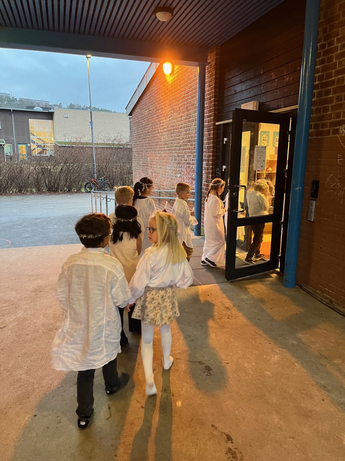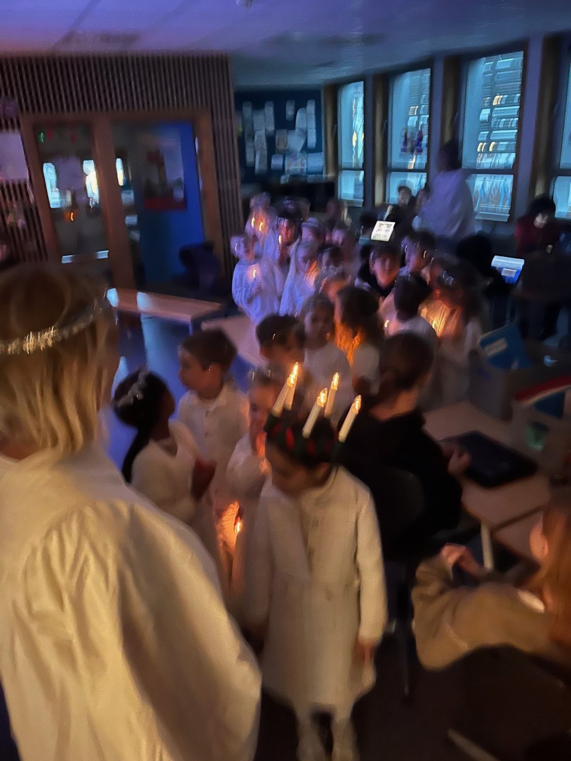 I dag gikk førsteklasse Luciatog og besøkte alle klassene. De sang vakkert og delte ut lussekatter som 6. klasse hadde bakt.