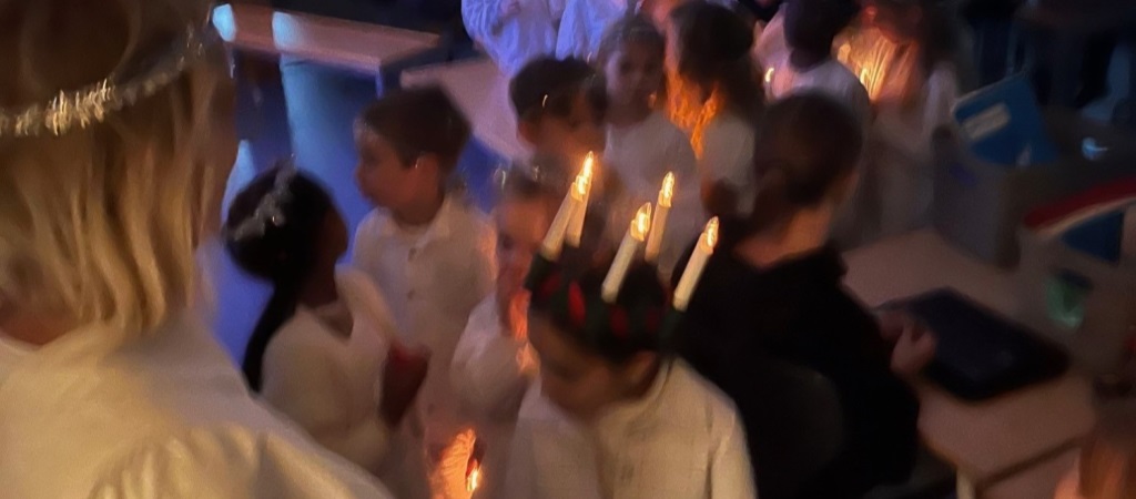 I dag gikk førsteklasse Luciatog og besøkte alle klassene. De sang vakkert og delte ut lussekatter som 6. klasse hadde bakt.