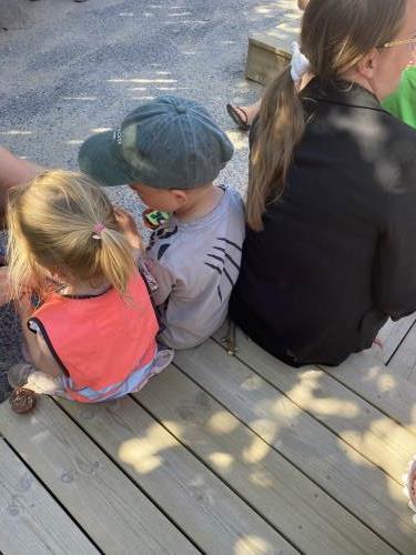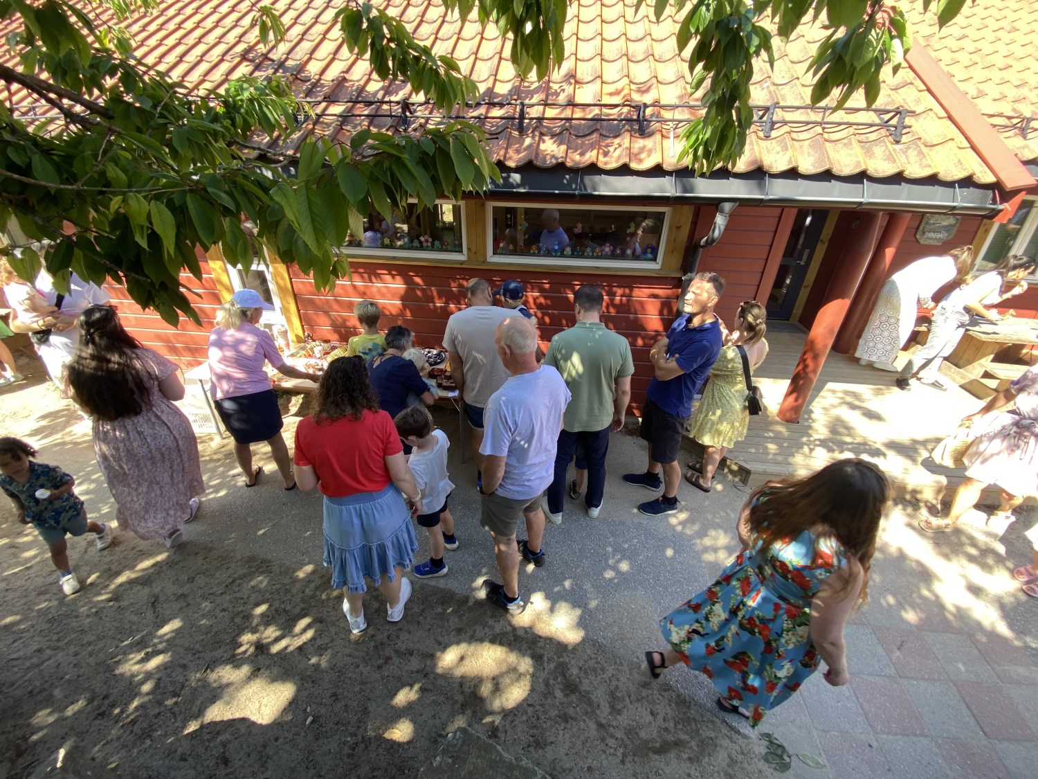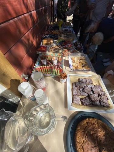 Etter den fine underholdningen samlet alle seg rundt kakebordet - og for et bord det var! 🍪🧁🍉 Foreldre hadde bidratt med et imponerende utvalg av kaker, muffins, frukt, småkaker og andre søtsaker. Bordet bugnet av fristelser, og det var noe for enhver smak. Barna koste seg med godsaker, mens vi voksne kunne slå av en hyggelig prat i sola.
