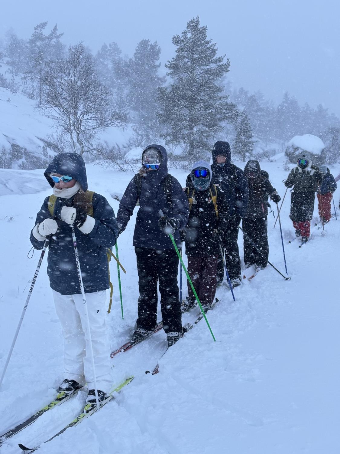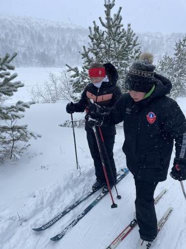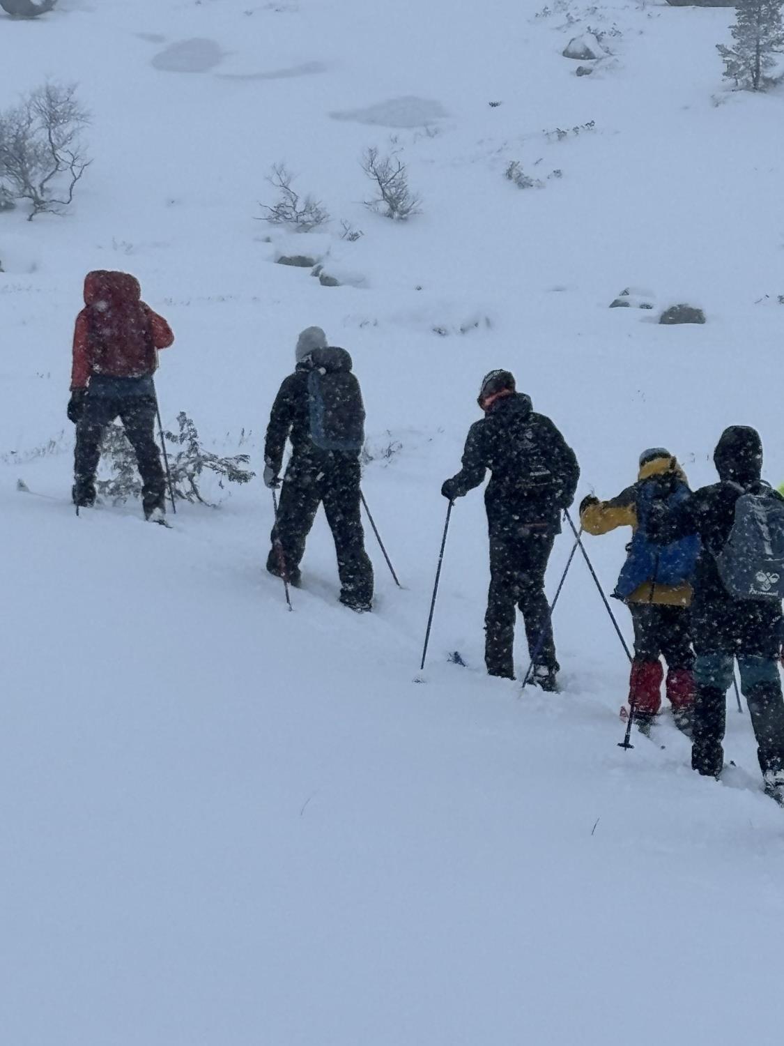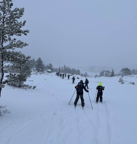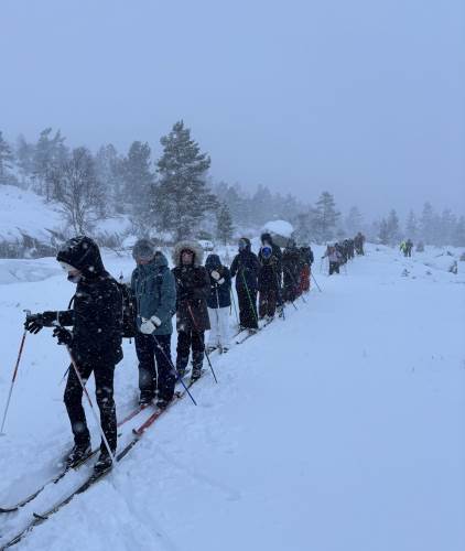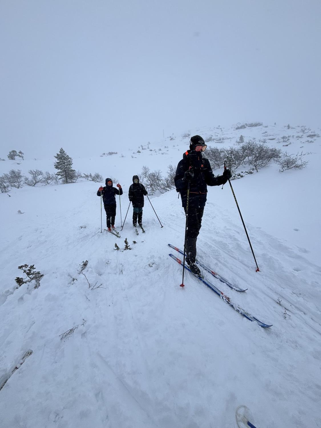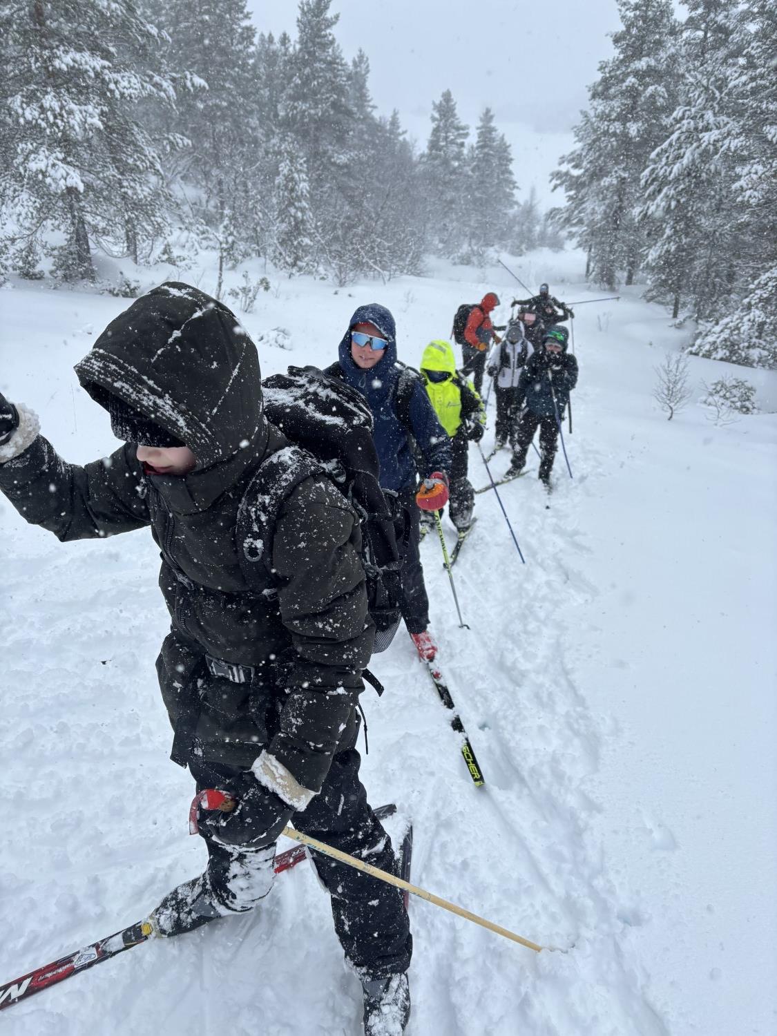 Me har hatt ein flott siste dag på Knaben, sjølv om vêrgudane ikkje var heilt med oss i dag heller. Mykje vind og snøbyger som kom sidelengs piska godt i ansiktet. Uansett lite klaging og mykje godt humør. Nokre elevar valgte å bli igjen ved leirskulen, mens 30 av elevane blei med på kort eller lang skitur.
