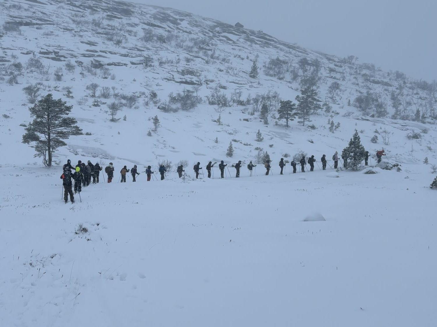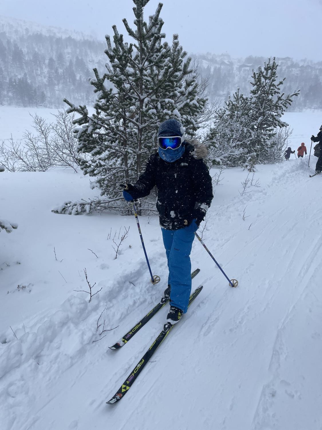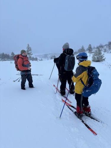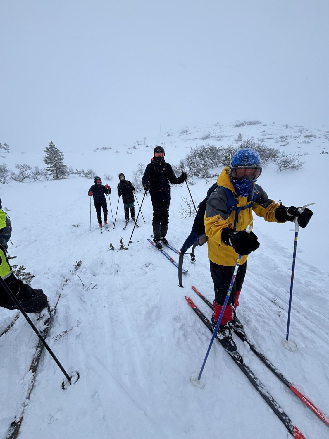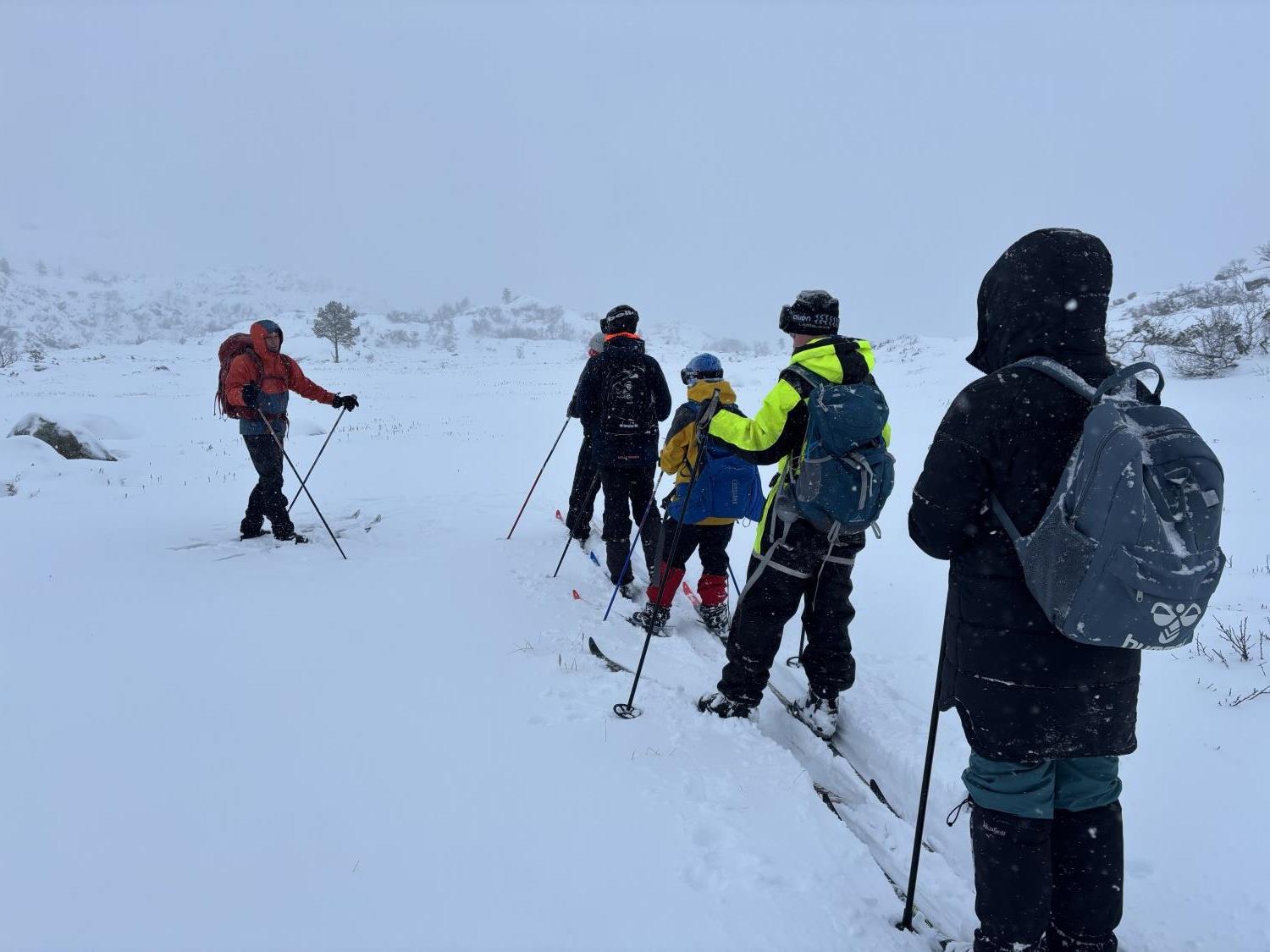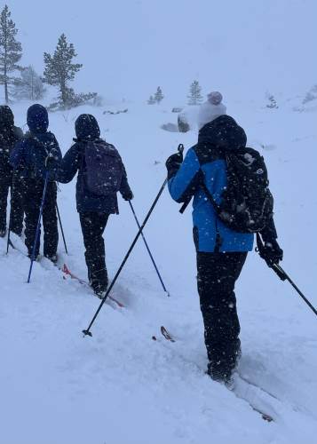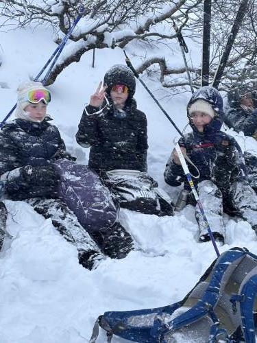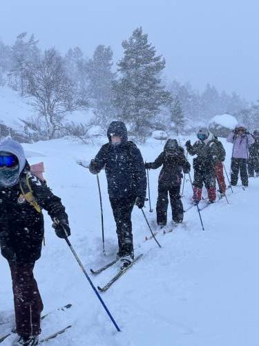 Me har hatt ein flott siste dag på Knaben, sjølv om vêrgudane ikkje var heilt med oss i dag heller. Mykje vind og snøbyger som kom sidelengs piska godt i ansiktet. Uansett lite klaging og mykje godt humør. Nokre elevar valgte å bli igjen ved leirskulen, mens 30 av elevane blei med på kort eller lang skitur.