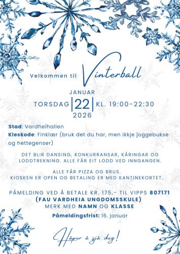 Torsdag 22. januar 2026 kl. 19:00-22:30 blir det vinterball for alle elevane på Vardheia ungdomsskule. Ballet skal vere i Vardheihallen.